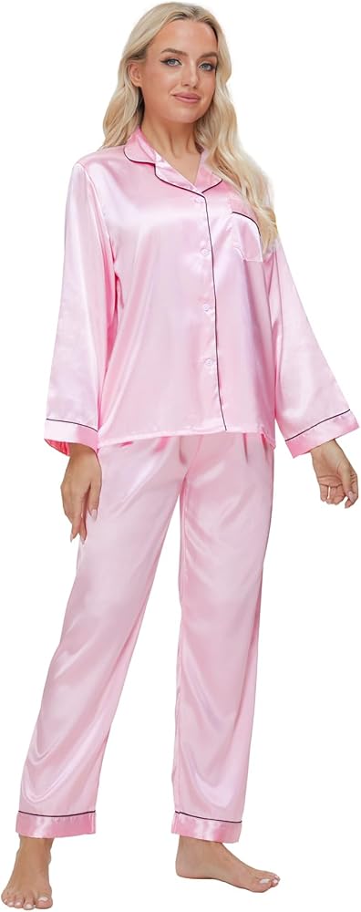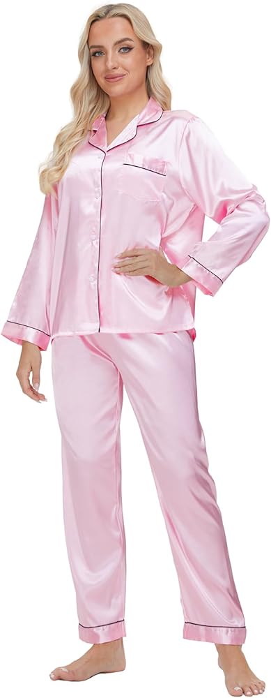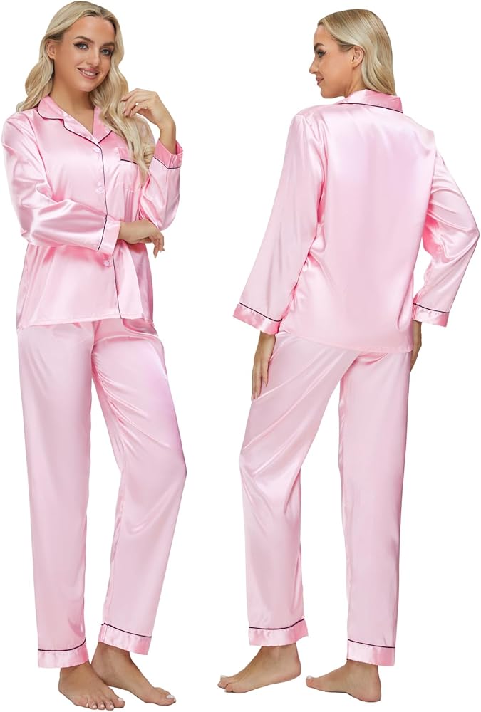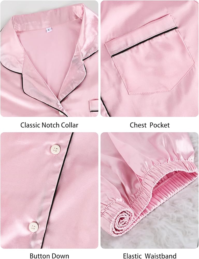 • تتميز مجموعة البيجامات النسائية لدينا بتصميم كلاسيكي مع لمسة عصرية. تضيف مادة الساتان لمسة من الأناقة، بينما يضمن الجزء العلوي ذو الأزرار وحزام الخصر المرن على البنطلون ملاءمة آمنة وقابلة للتعديل.