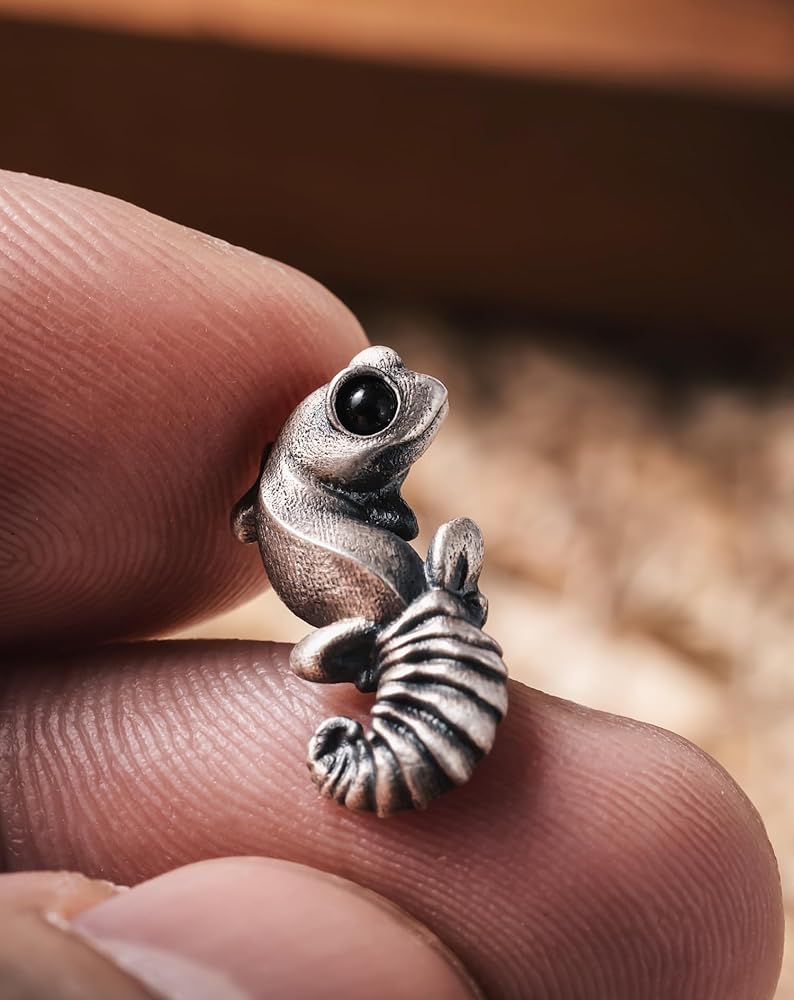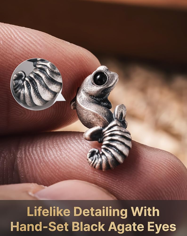 حرفية ممتازة: العيون مصنوعة بدقة من الزركونيا السوداء، مما يحاكي بشكل مثالي قوة الحياة النابضة بالحياة لـ Knob Tail Gecko. تم تصميم كل التفاصيل بعناية، بدءًا من ملمس الجلد وحتى الذيل المميز، مما يوضح تفانينا في التصميم المعقد. والنتيجة هي قطعة مجوهرات فريدة ومذهلة تعزز العلاقة الأعمق بين البشر والحيوانات.