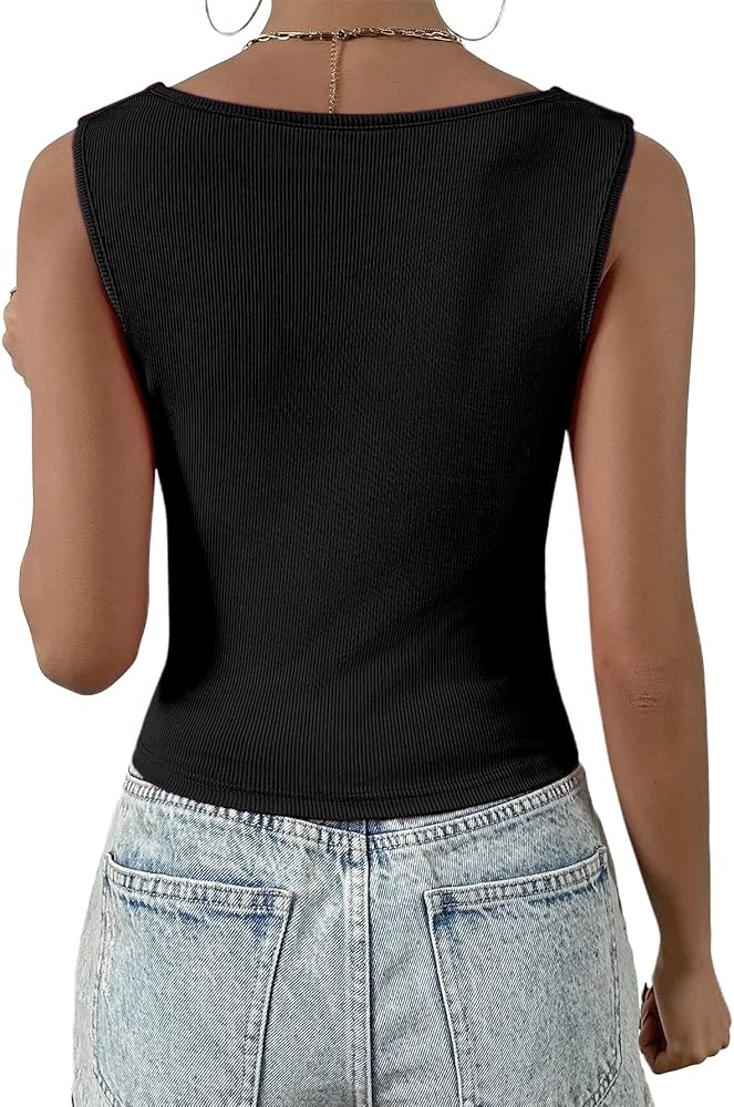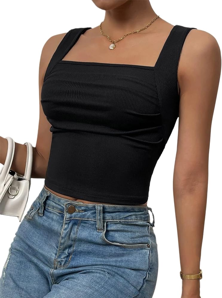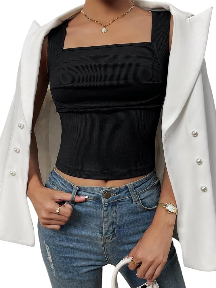 التصميم: قمصان قصيرة للسيدات عصرية، رقبة واسعة، صدر مكشكش، مقاس نحيف، طول قصير، قميص علوي بدون أكمام مضلع، قميص كامي بدون أكمام، قميص قصير أسود
