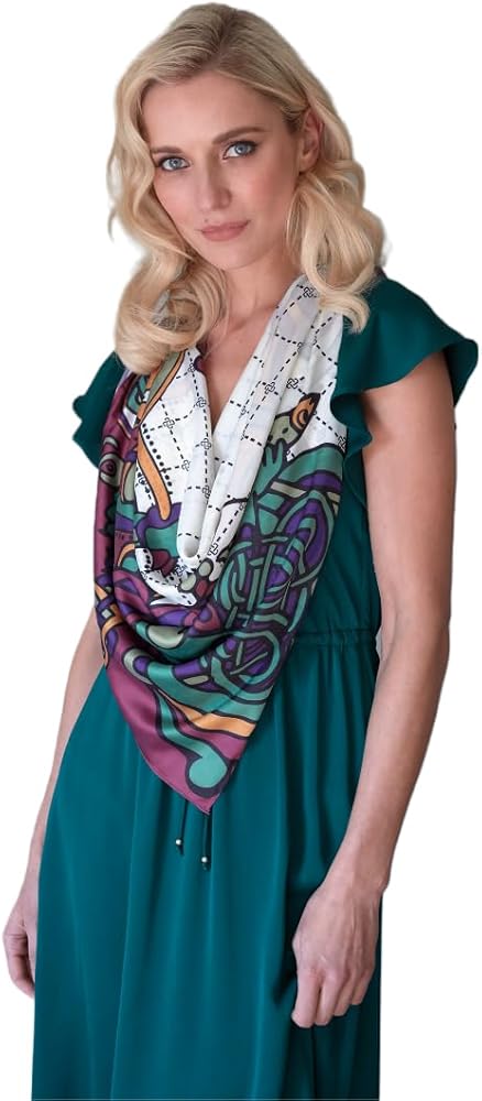• Celtic-inspired design: This scarf is adorned with a pattern of delicate Celtic Knots symbolizing the interconnectivity of the world and a multi-colored Celtic Peacock suggesting immortality.