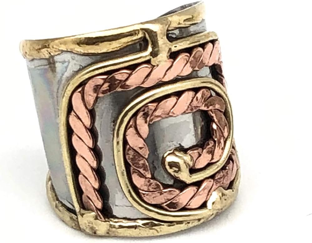 Adjustable handcrafted stainless steel cuff ring with brass and copper accents. Adjustable design made to fit all sizes! At Anju, we create unique handcrafted products that blend traditional craftsmanship with modern trends resulting in an artistic expression that is authentically Anju. By partnering with artisan communities, we are able to provide an economic opportunity for our artisans and their families in an environment that supports cultural heritage, creative expression, and fair trade practices.