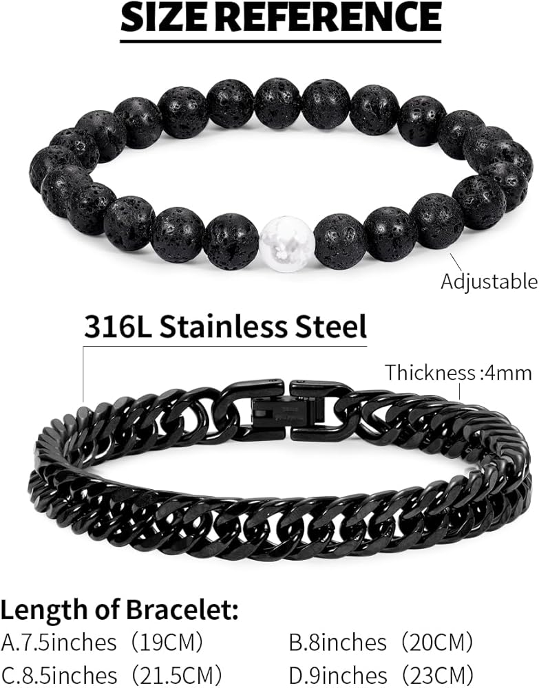 سوار سلسلة للرجال: يحتوي هذا السوار على قطعتين من أساور الخرز القابلة للتعديل، والأساور الأخرى المكونة من قطعتين لها مقاسات 7.5/8/8.5/9 بوصة على التوالي. يمكن لكل من الرجال والنساء ارتداء هذا السوار، ويمكنك قياس حجم معصمك للاختيار من بينها، مع تجنب المقاسات غير المناسبة.