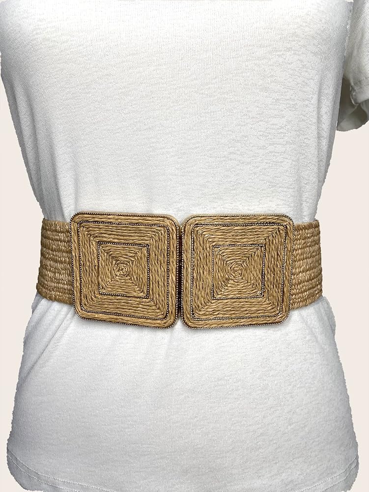 - Straw woven style, symmetrical square buckle, cinch Belt