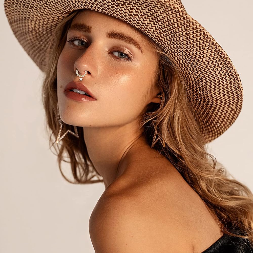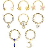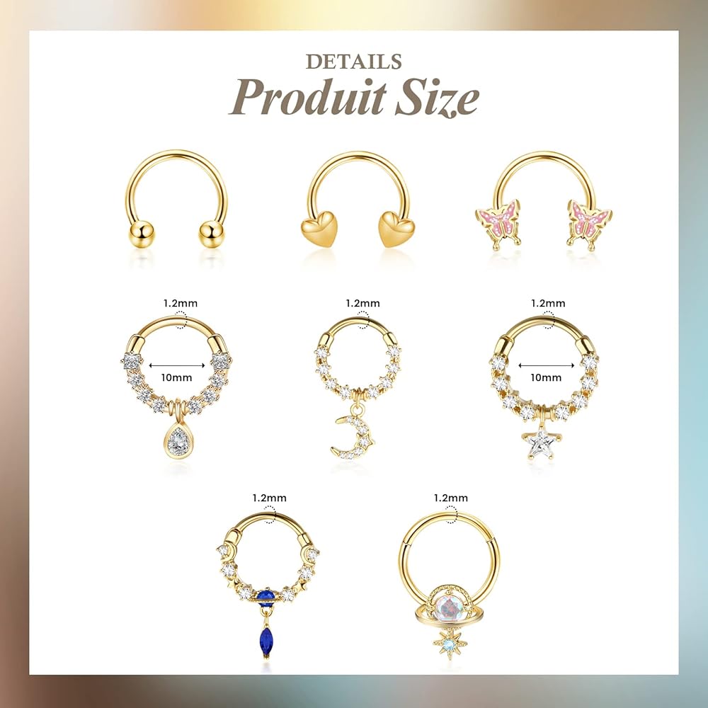 • 【حلقات حاجز 16 جرام】طلب واحد يمكنك الحصول على 8 قطع من حلقات الحاجز المختلفة، بما في ذلك حلقة حاجز الفراشة، وحلقة حاجز متدلية على شكل نجمة، وحلقة حاجز CZ، إلخ. تصميم أنيق وعصري يتيح لك إحساسًا عصريًا فريدًا.