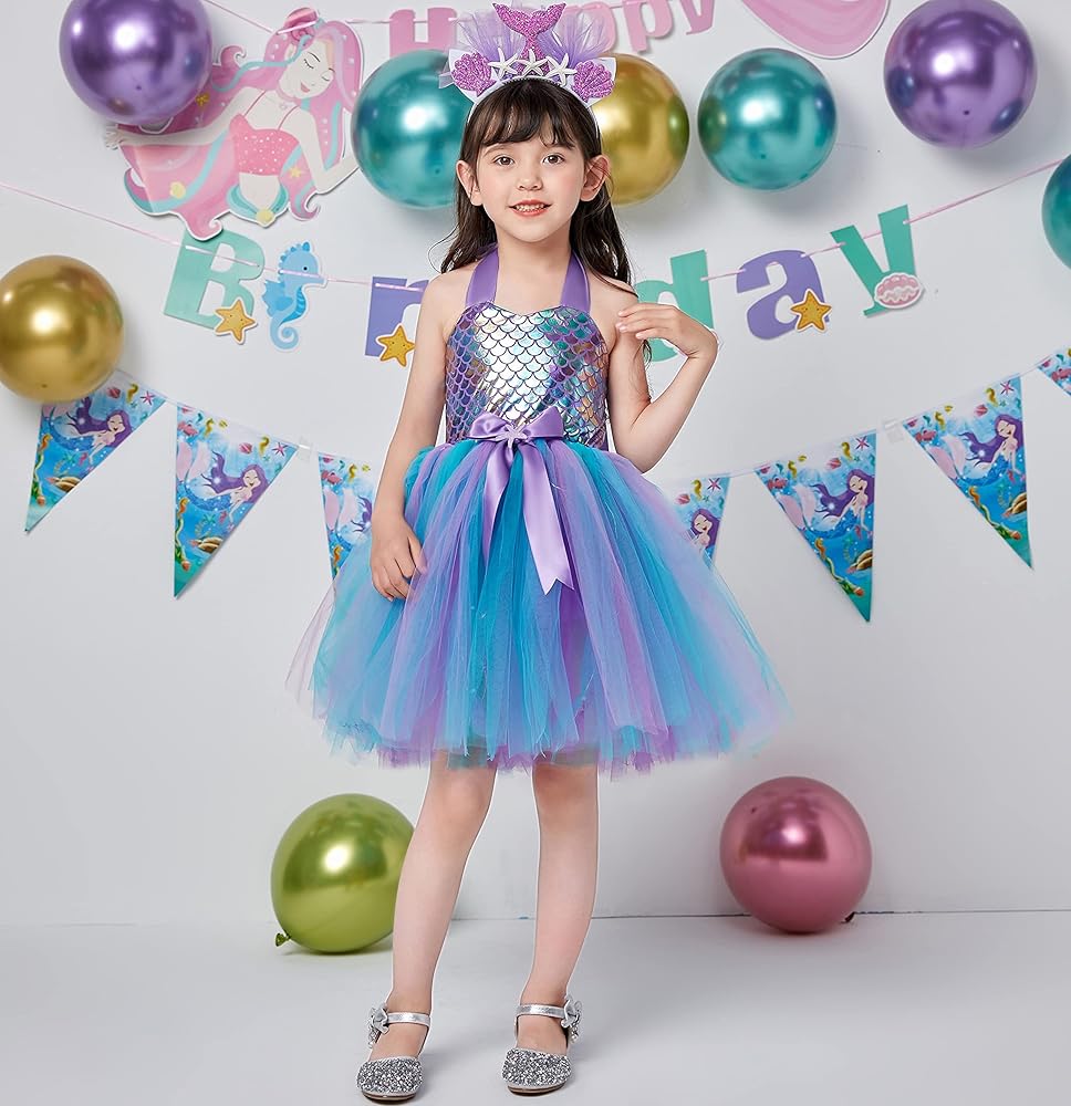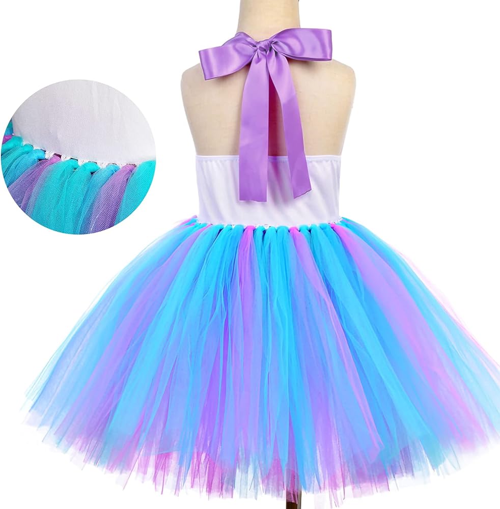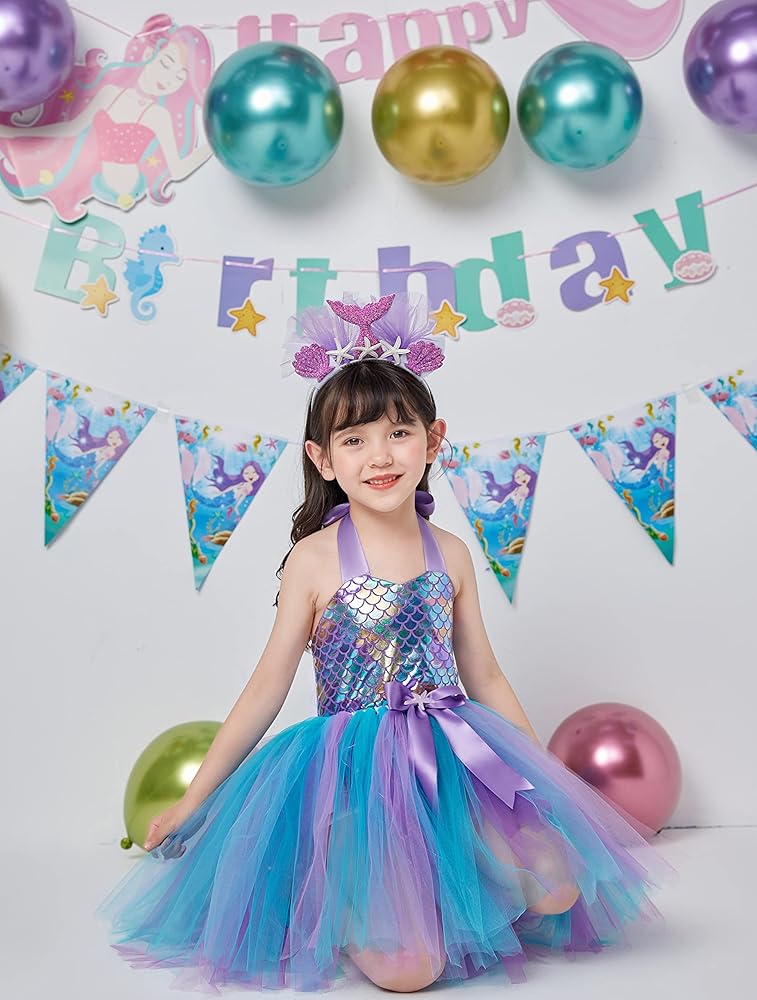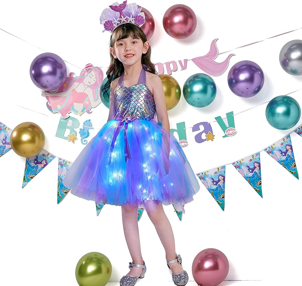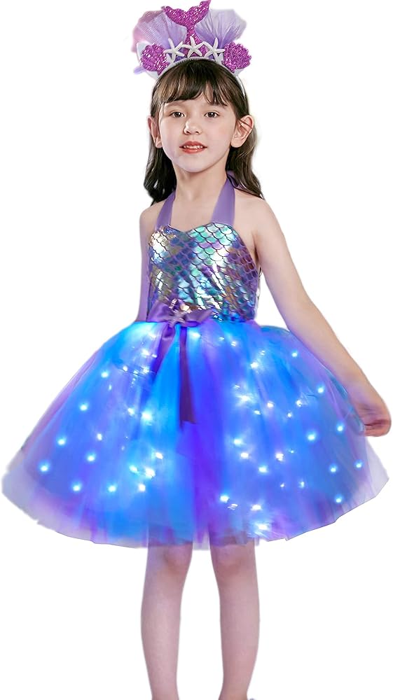 【تصميم فريد لفستان حورية البحر】 تم تصميم فستان حورية البحر من Davsolly للفتيات الصغيرات اللاتي يعشقن قصة حورية البحر ويحلمن بأن يصبحن أميرة حورية البحر. الجزء السفلي المضيء بمصباح LED يجعل فستان توتو حورية البحر هذا رائعًا، وعصابة الرأس الملونة تضيف قصة إلى الأعلى. ثق بأن الفتاة الصغيرة ستكون أميرة في الحفلة!