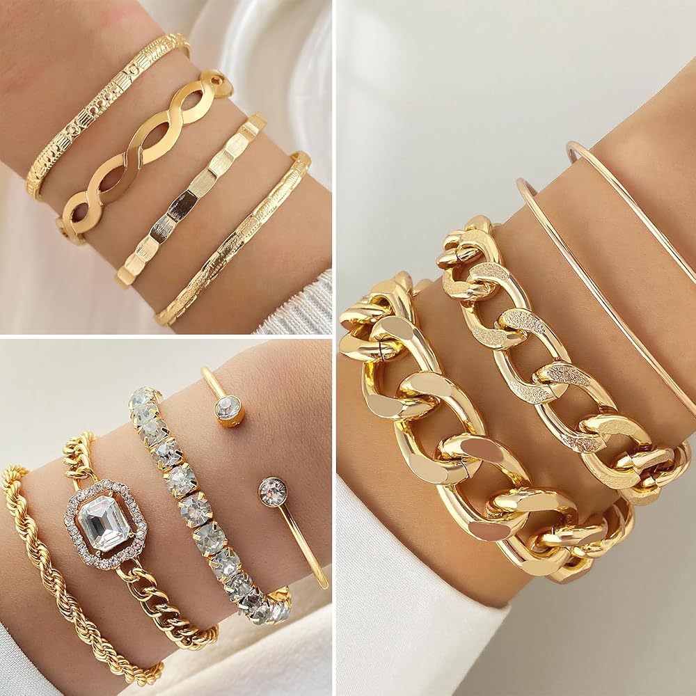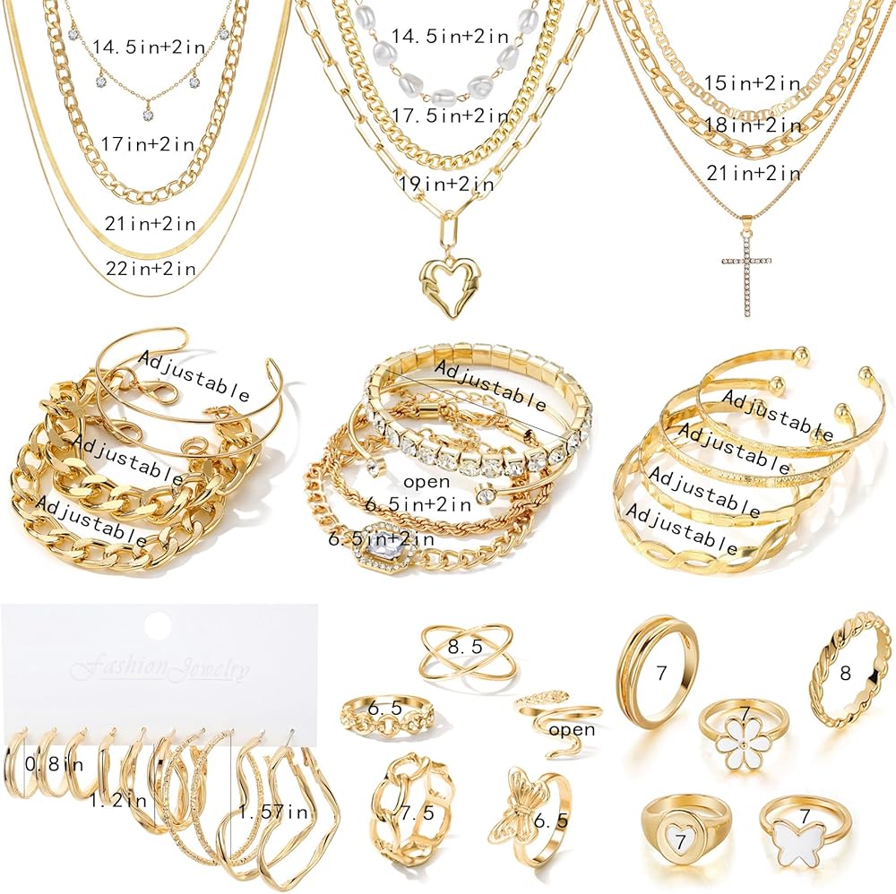 【Must-Have Jewelry Set】Elevate your style with our handpicked 41-piece gold jewelry set.Get 10 necklaces,11 bracelets,10 knuckle rings,and 10 dangle earrings—all in one swoop.From layered pearl necklaces to chunky bracelets and heart earrings,it's a treasure trove of trendy and elegant options