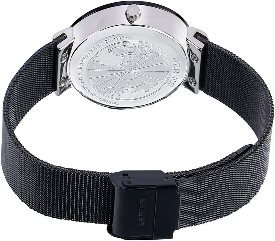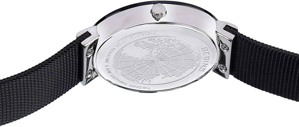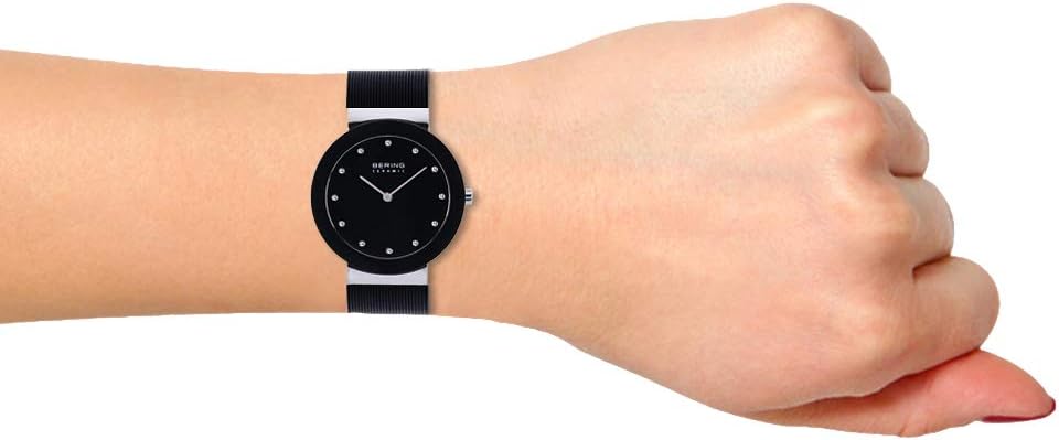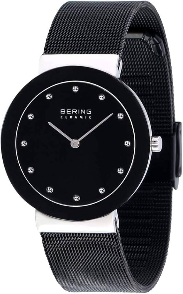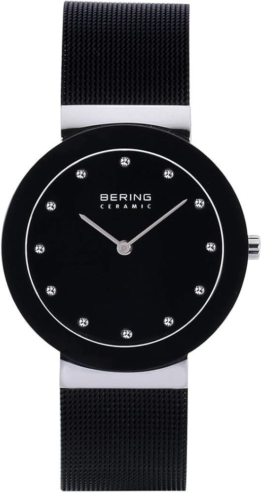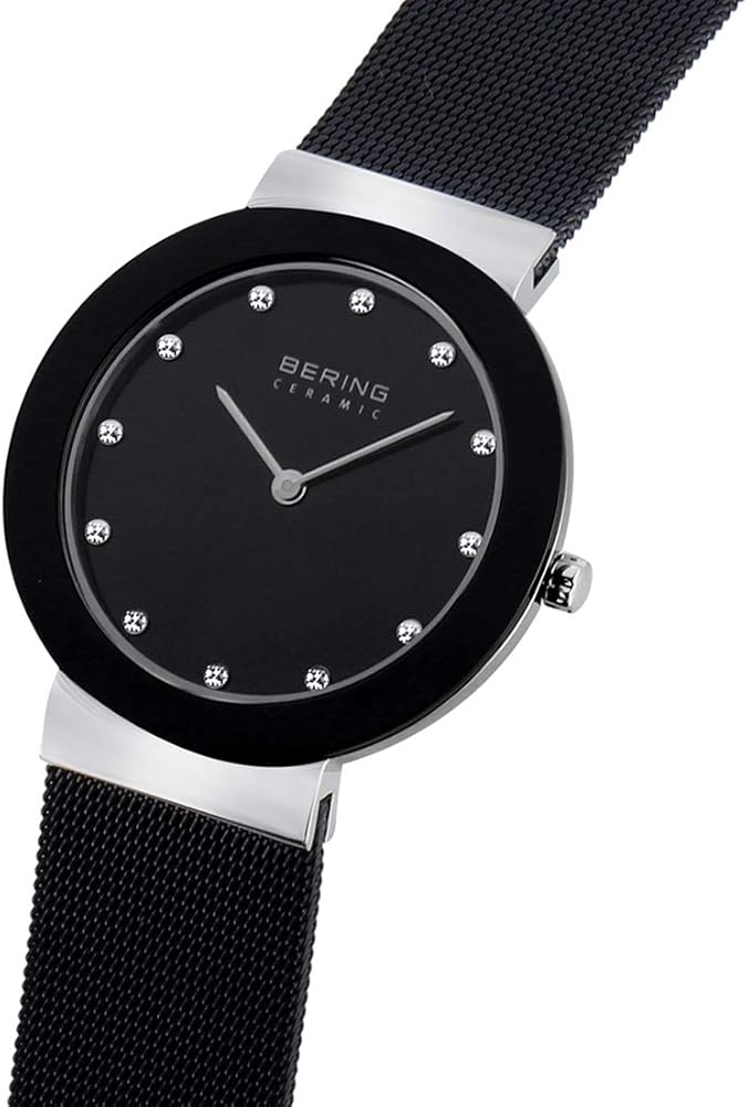 • تتميز ساعة BERING بكريستال ياقوتي مسطح مقاوم للخدش يغطي القرص الأسود المزخرف بعناصر سواروفسكي