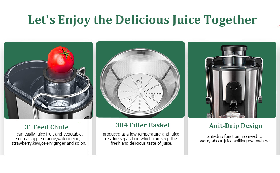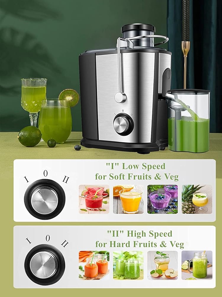 【Customize Your Juicing】Explore more possibilities of juice by two speeds custom settings for easy extraction of maximum juice from fruit and vegetable. Speed "I" (12,000 RPM to 15,000 RPM) for "soft" types: celery, watermelon, orange, etc. Speed "Ⅱ"(15,000 RPM to 18,000 RPM) for "hard" types: apples, carrots, etc. The juicer machines can perfectly separate juice and pulp, making a variety of healthy juices for your family.