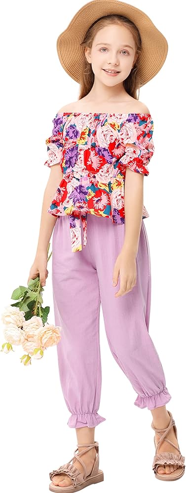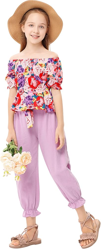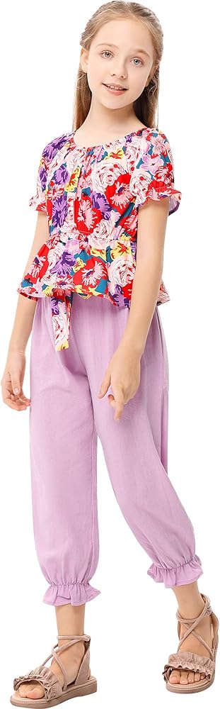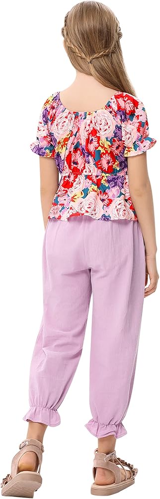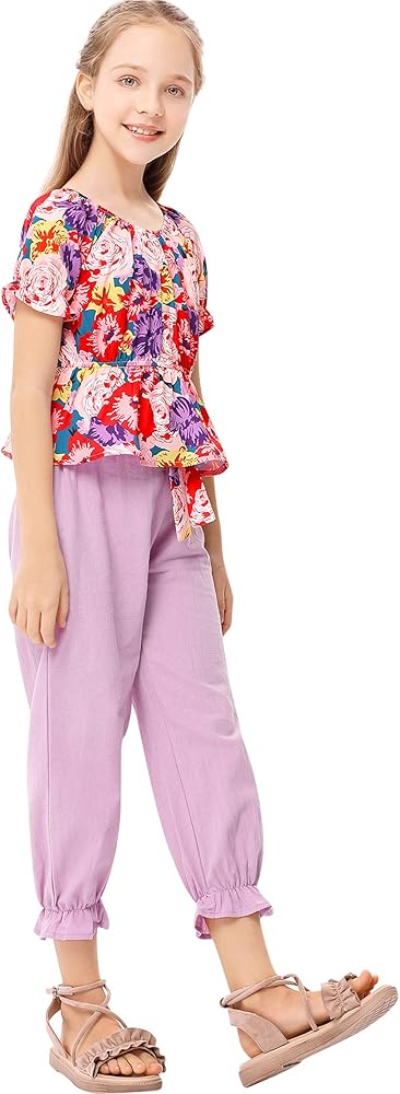 • 【DESIGN】:Girls clothes sets are designed with short puff sleeve and printed top +loose pant+cute belt, which making your girls cute and fashionable.