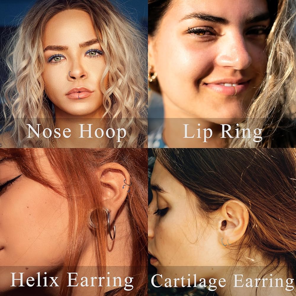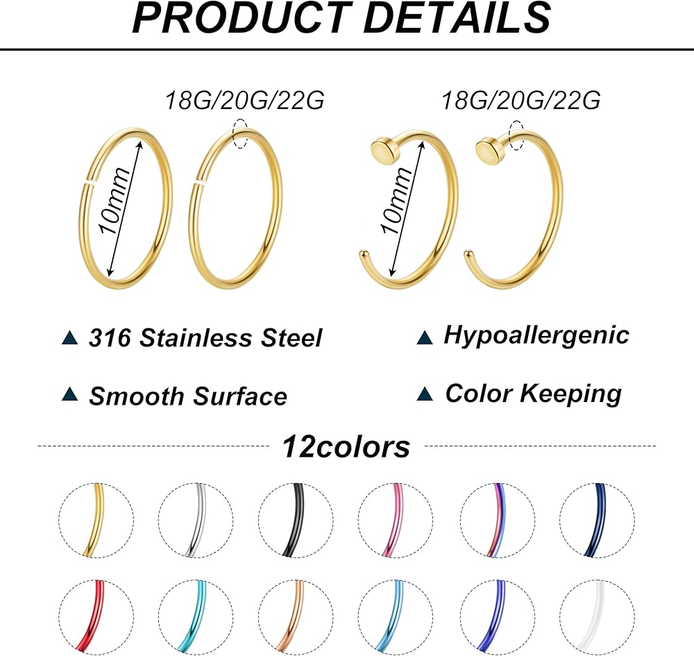 🌻حجم مريح: حجم المقياس: 18 جم (1.0 مم). القطر الداخلي: 8 مم، مقاس قياسي، مناسب لمعظم النساء والرجال. النمط الكلاسيكي والبسيط لأطواق الأنف مناسب لمختلف المناسبات، مثل الملابس اليومية والحفلات والرياضة والتسوق وما إلى ذلك، مما يجعلك تبدو أكثر سحرًا وشخصية.