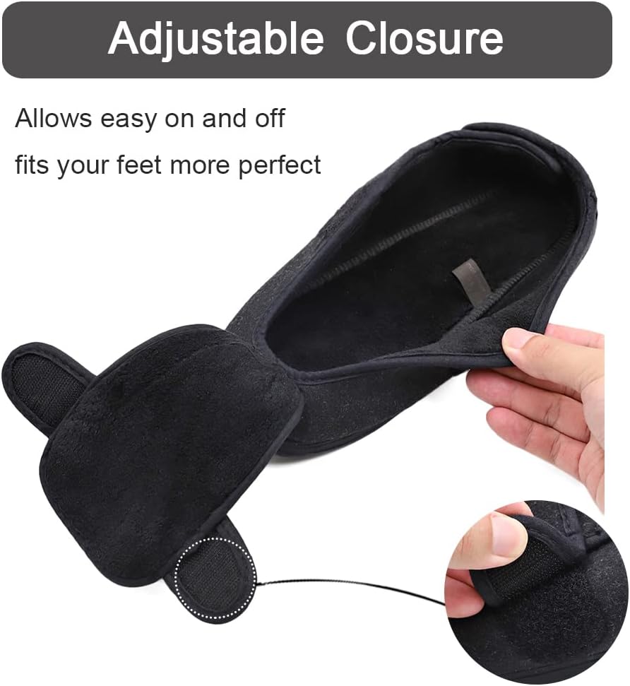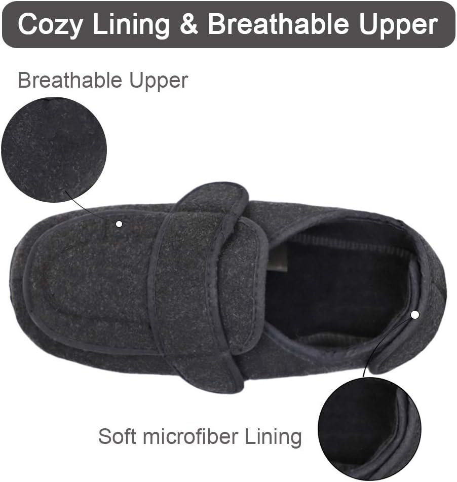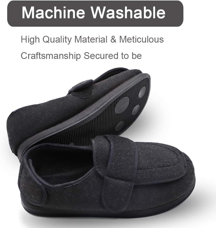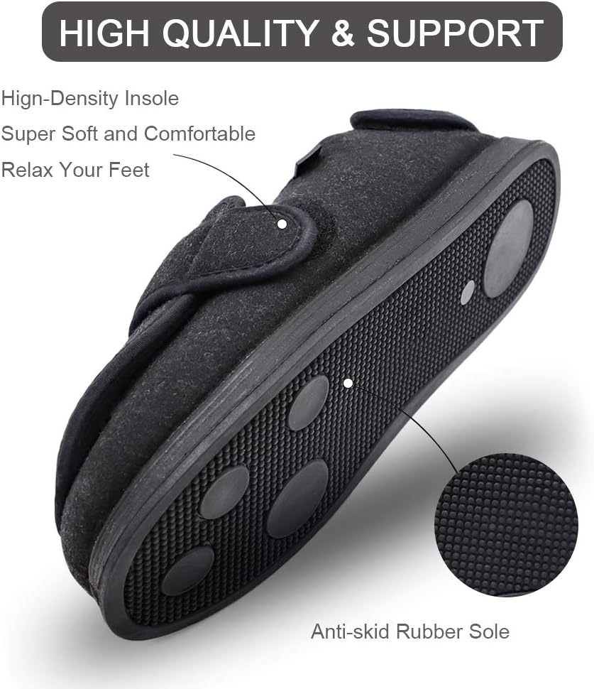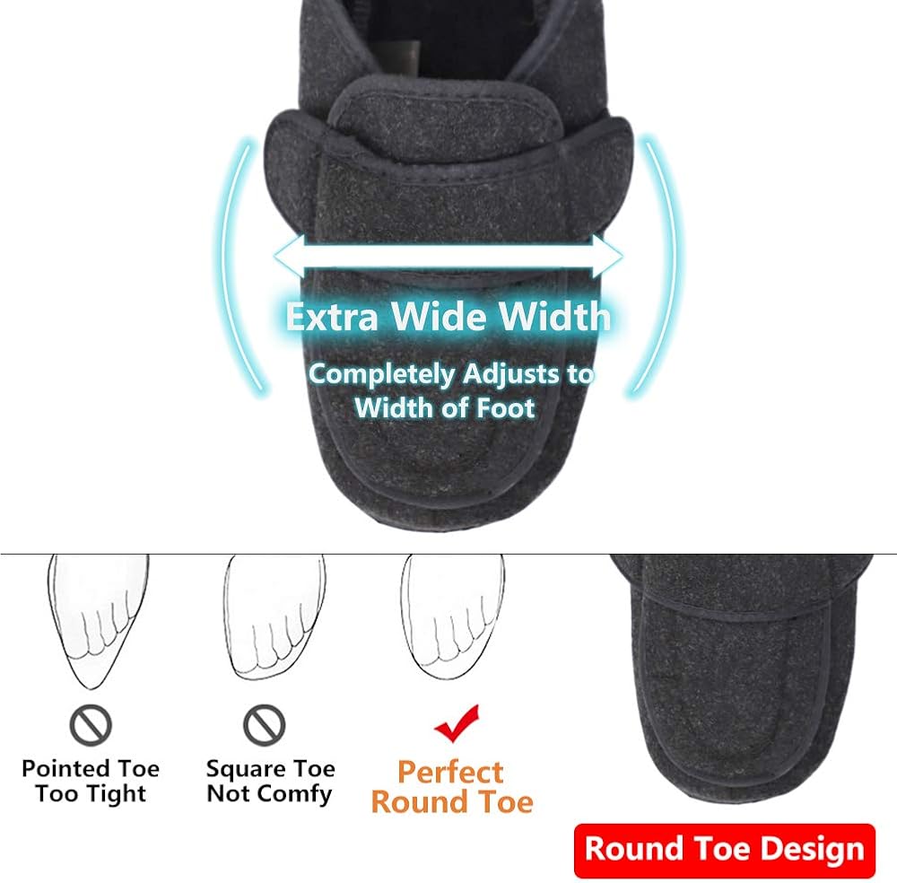 جودة عالية وصناعة جيدة - الأجزاء العلوية من هذه النعال ذات العرض الواسع للغاية مصنوعة من مواد ناعمة وعالية الجودة. النعل الداخلي من الإسفنج عالي الكثافة يجعل هذه الأحذية ذات الأقدام العريضة مرنة لذا فهي جيدة للمشي، مما يوفر لك حماية ضد الانزلاق. تم توسيع رأس شبشب المسنين العلاجي حتى لا يضغط على القدم.