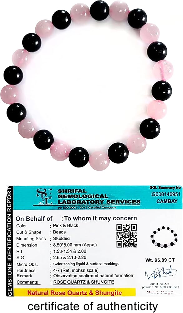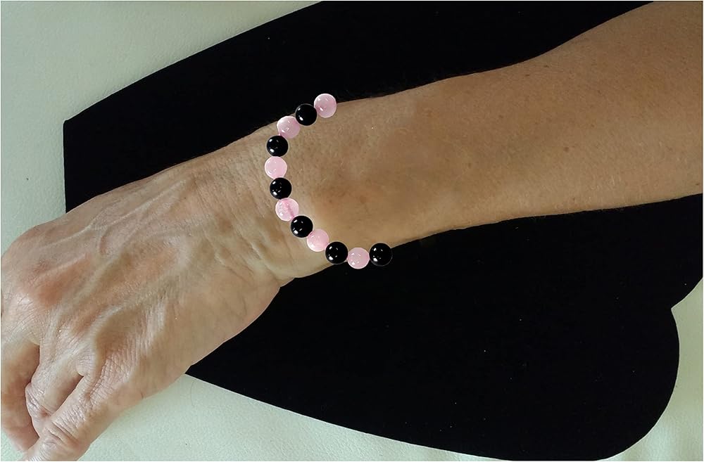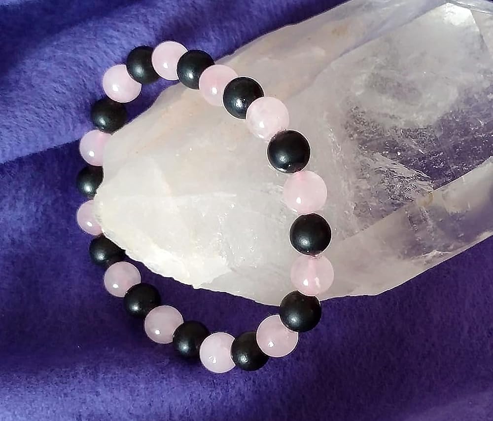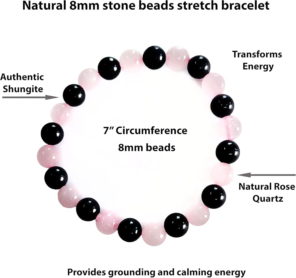 سوار من الأحجار الكريمة الطبيعية يحتوي على شونجيت وكوارتز وردي. يعتبر الكوارتز الوردي حجر الحب ويرتبط بشاكرا القلب. الشونجيت هو محول طاقة. معًا يصنعون سوارًا عصريًا قابل للتمدد ويناسب البالغين العاديين. يبلغ محيطها حوالي 7 انش، مع خرز 8 ملم.