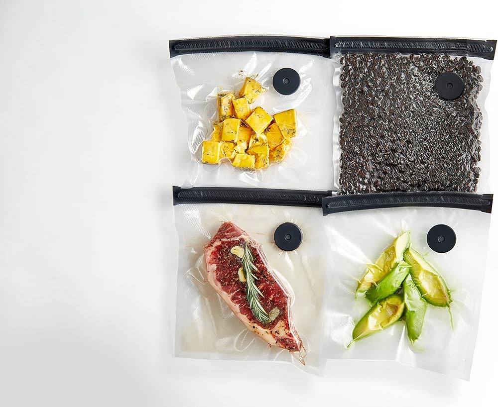 أكياس موثوقة قابلة لإعادة الإغلاق، لتخزين الطعام والفيديو. فتحة قابلة لإعادة الإغلاق وممر هواء دقيق يجعل من الممكن إغلاق هذه الأكياس العملية مرارًا وتكرارًا باستخدام أي سدادة تفريغ الهواء الدقيقة من انوفا مع مجرى هواء دقيق. مثالي للطهي وتخزين الطعام، كما أن الهيكل القوي يمكن غسله وإعادة استخدامه عند الطهي أو تخزين الأطعمة الخفيفة وغير الفوضوية.
