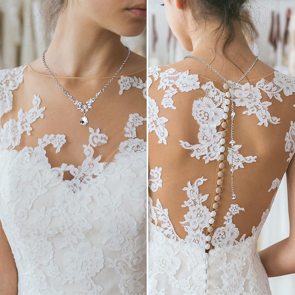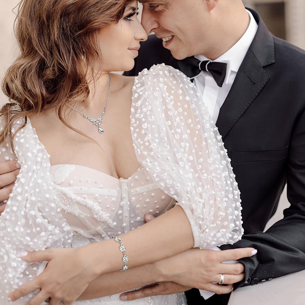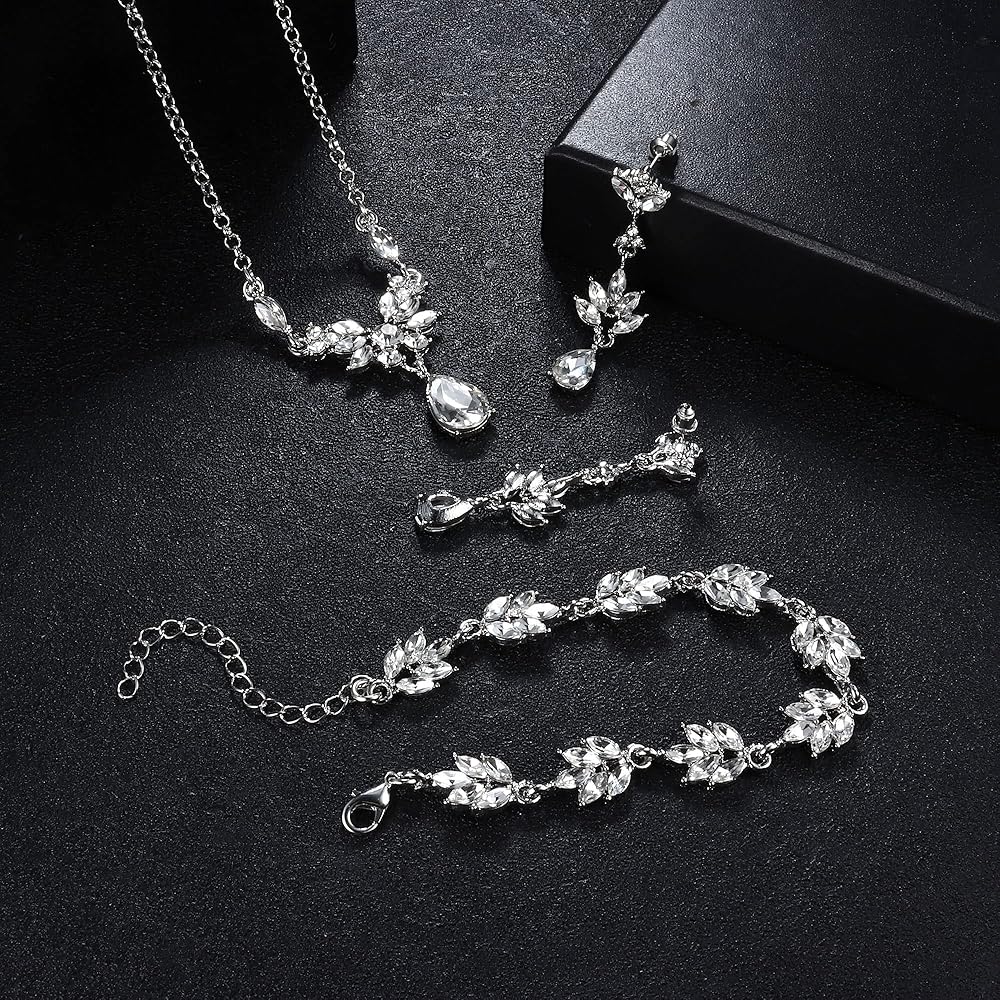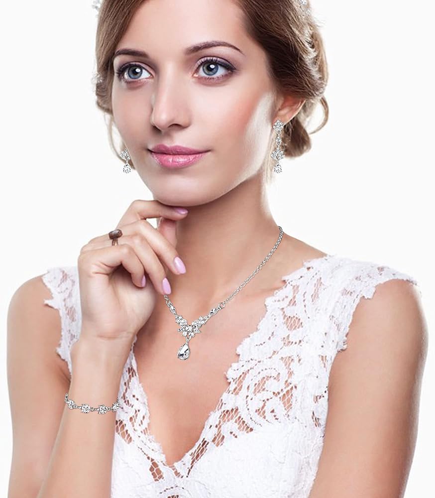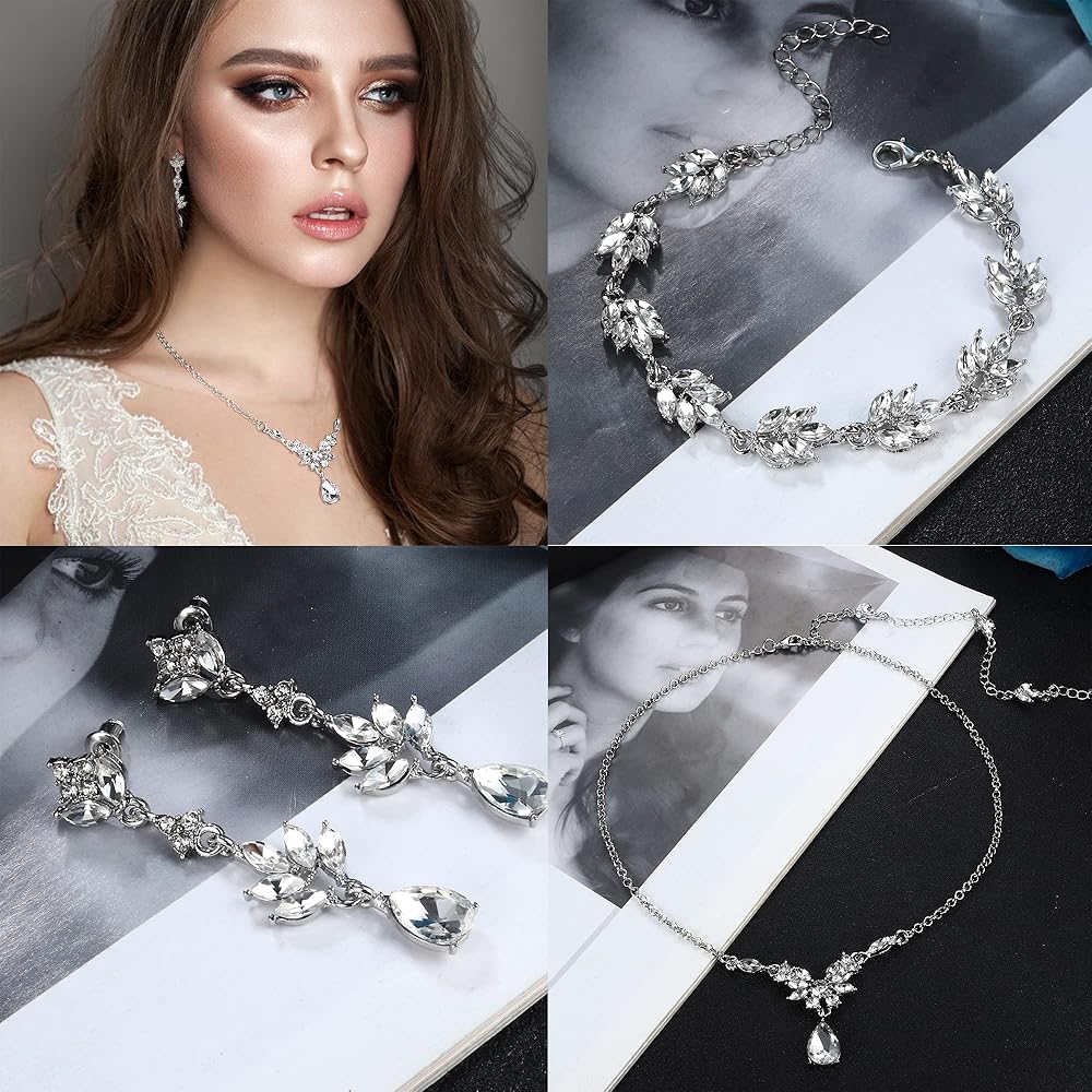 【مجموعة مجوهرات الزفاف】مجموعة مجوهرات الزفاف تأتي مع قلادة خلفية من حجر الراين، وسوار زفاف واحد وزوج من الأقراط المتدلية على شكل دمعة/زوج واحد من الأقراط المشبك على الأقراط، لامعة للغاية، يمكن أن تظهر جاذبيتك بشكل جيد.