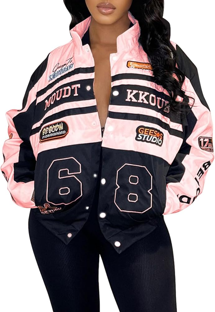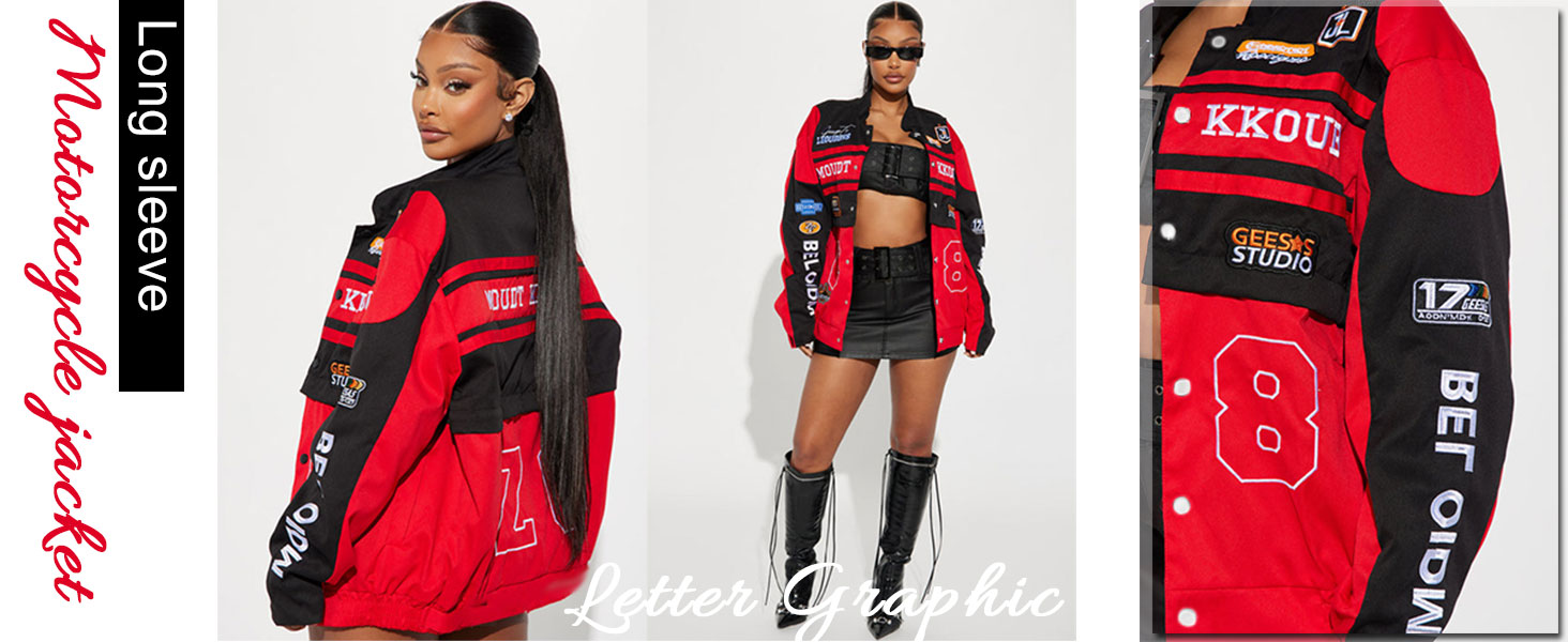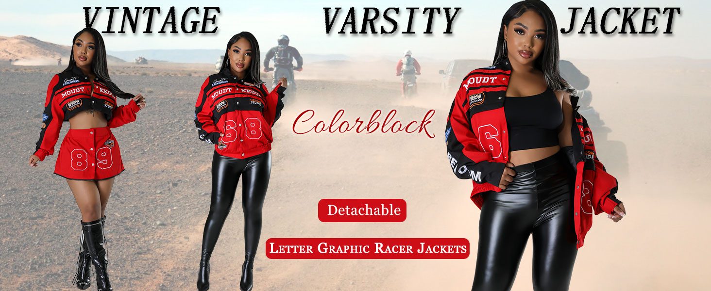 【فريدة من نوعها وتصميم】: سترة دراجة نارية تتميز بطباعة حروف جرافيكية عتيقة وصدرية قابلة للفصل مع سحاب في المنتصف يفصل الجزء السفلي، وأكمام طويلة، وجيبين جانبيين، وزر إغلاق بكباس، وخصر مرن، وملاءمة كبيرة الحجم، وياقة واقفة. سباق كاجوال و تصميم ليترمان، معاطف بيسبول عصرية، سترة قيادة أنيقة.