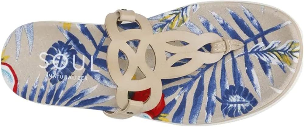 Cool comfort. Keep your options open in this slip-on sandal from SOUL Naturalizer featuring chic cutout designs. Inspired by the way you live. Comfortable slip-on sandal with cutout designs. Synthetic or metallic/Synthetic upper with a round toe. All-Thru Comfort: soft foam lining, arch support with memory foam, lightweight and flexible outsole. Grooved sole. 1 1/4" heel. Consciously packaged: 100% of our shoe boxes are made of 80% recycled paper + soy-based ink. Designed using sustainable materials. WHY YOU'LL LOVE IT: Ingenious relaxed utility. Unstructured, uncomplicated styles thoughtfully designed with your comfort in mind so you can live in the moment. Available in an inclusive size range of tough-to-find sizes and widths for a better fit and feel.