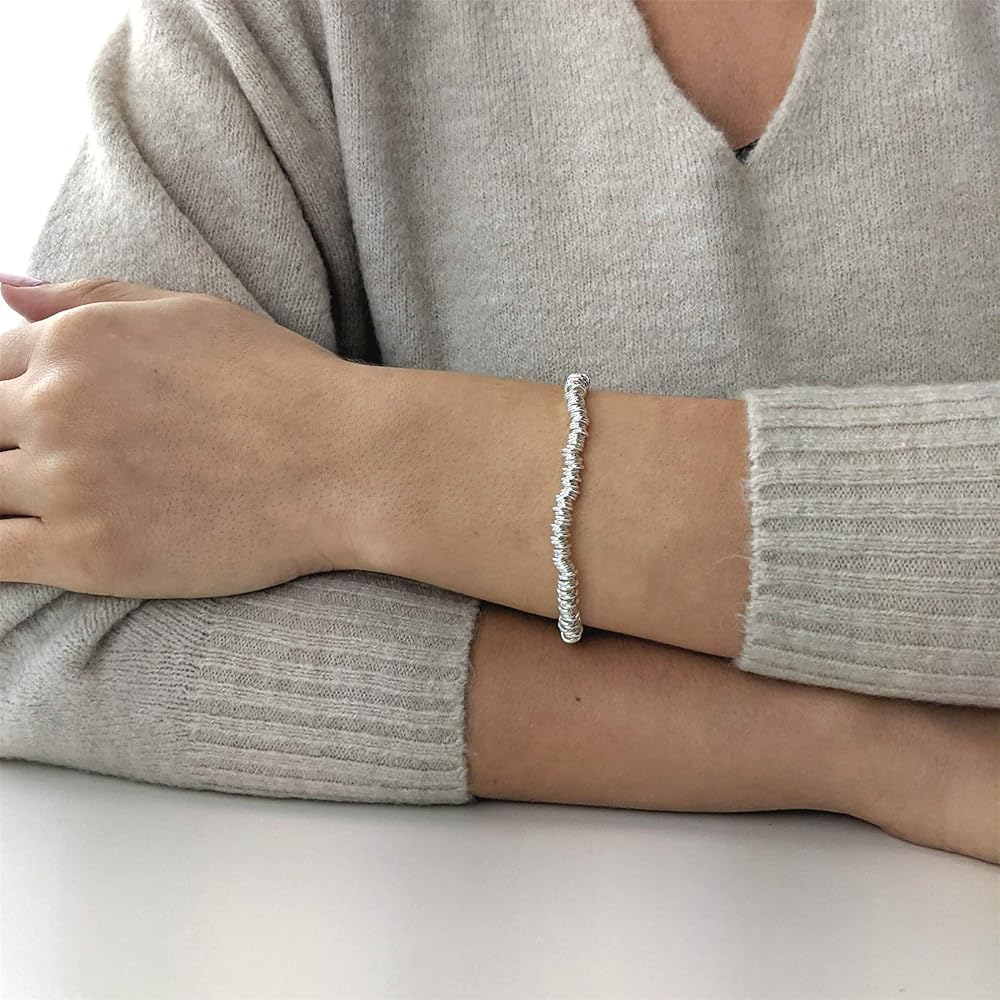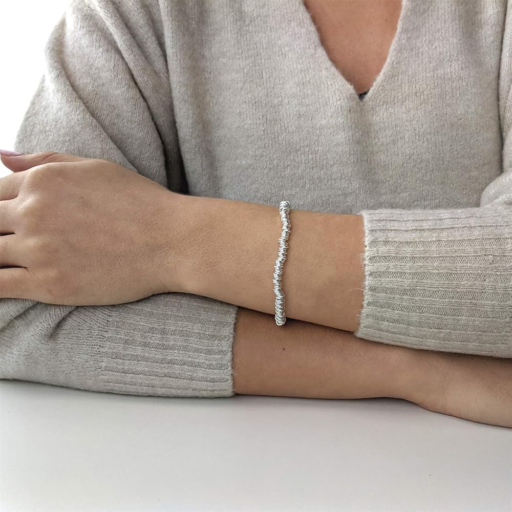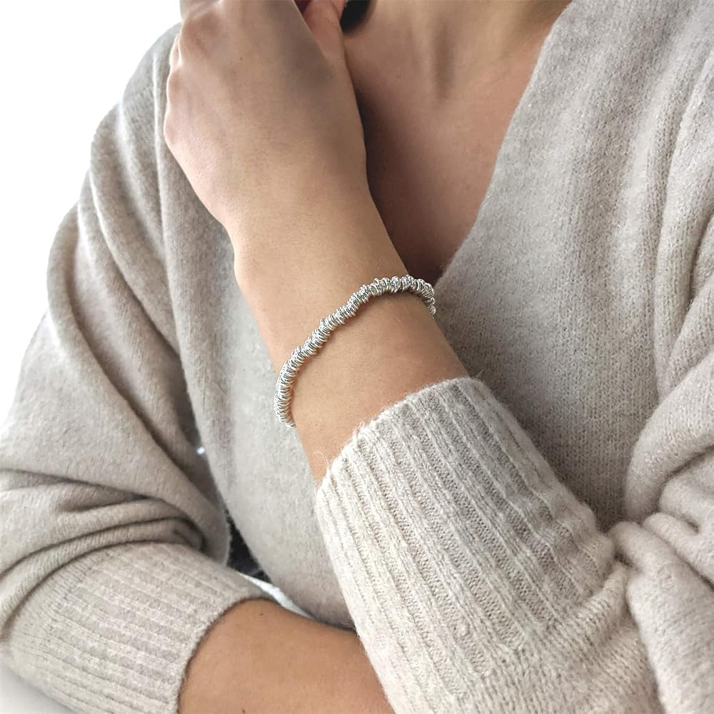 هذا سوار رائع من الفضة الإسترلينية مصنوع من عدة حلقات من الفضة الإسترليني تم تغذيته على خيط نايلون مرن شفاف. عرض السوار 4.5 ملم. الوزن 16.74 جرام. مثالية لربط أي مشبك بالحلي. يأتي المنتج في صندوق هدايا يحمل العلامة التجارية Silverly مع قطعة قماش تحمل العلامة التجارية Silverly لتلميع منتجاتك الفضية.