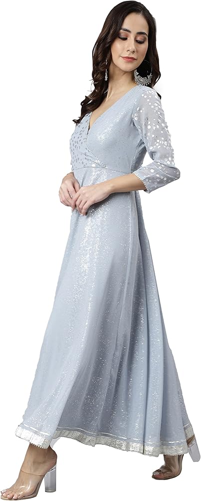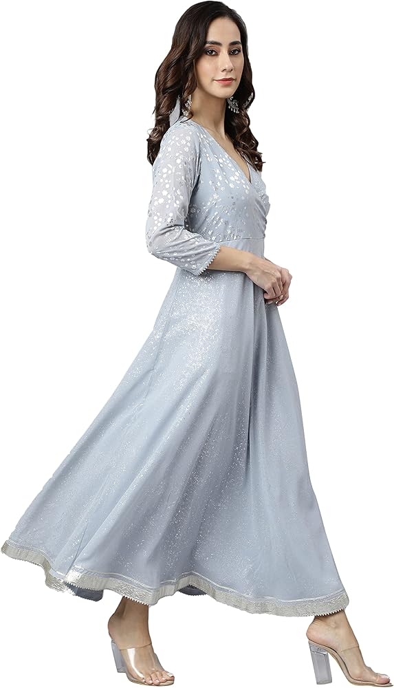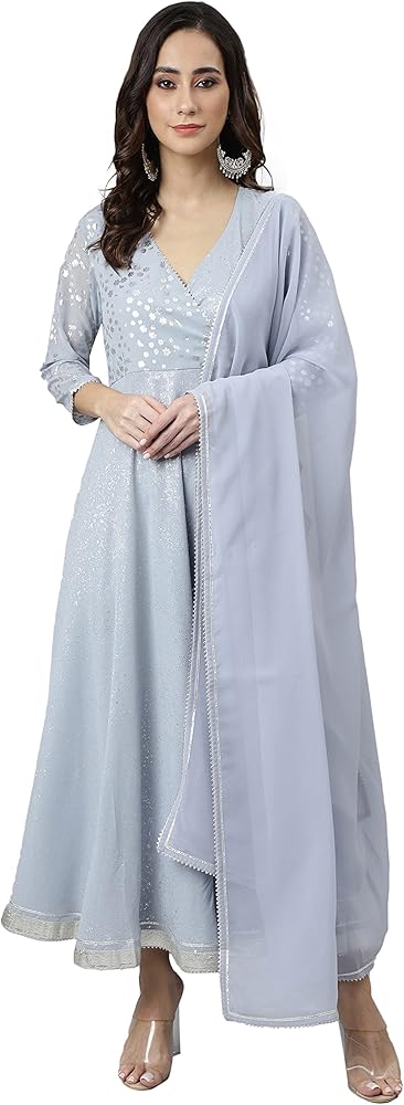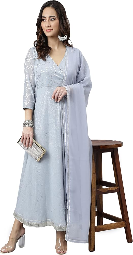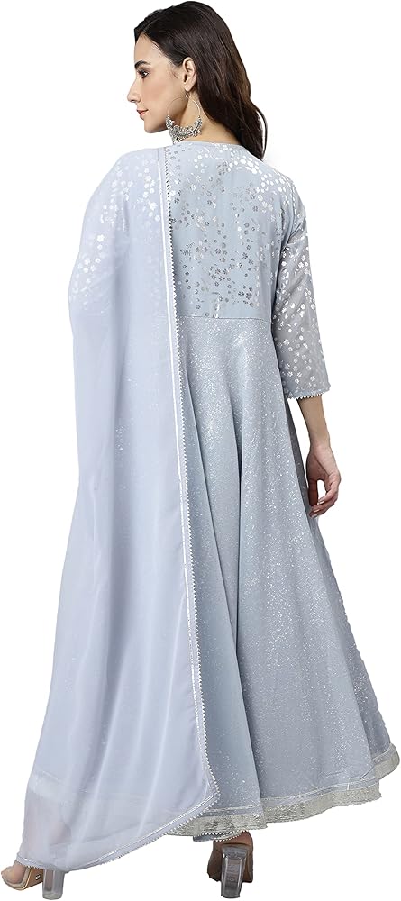 Be a classy gal with this solid grey anarkali kurta set with dupatta by Janasya with a tinge of silver lace detailing to compliment the look. This georgette kurta features V neck, 3/4 Sleeve and floor length. Pair it up with oxidised jewellery and jaipuri mojari.