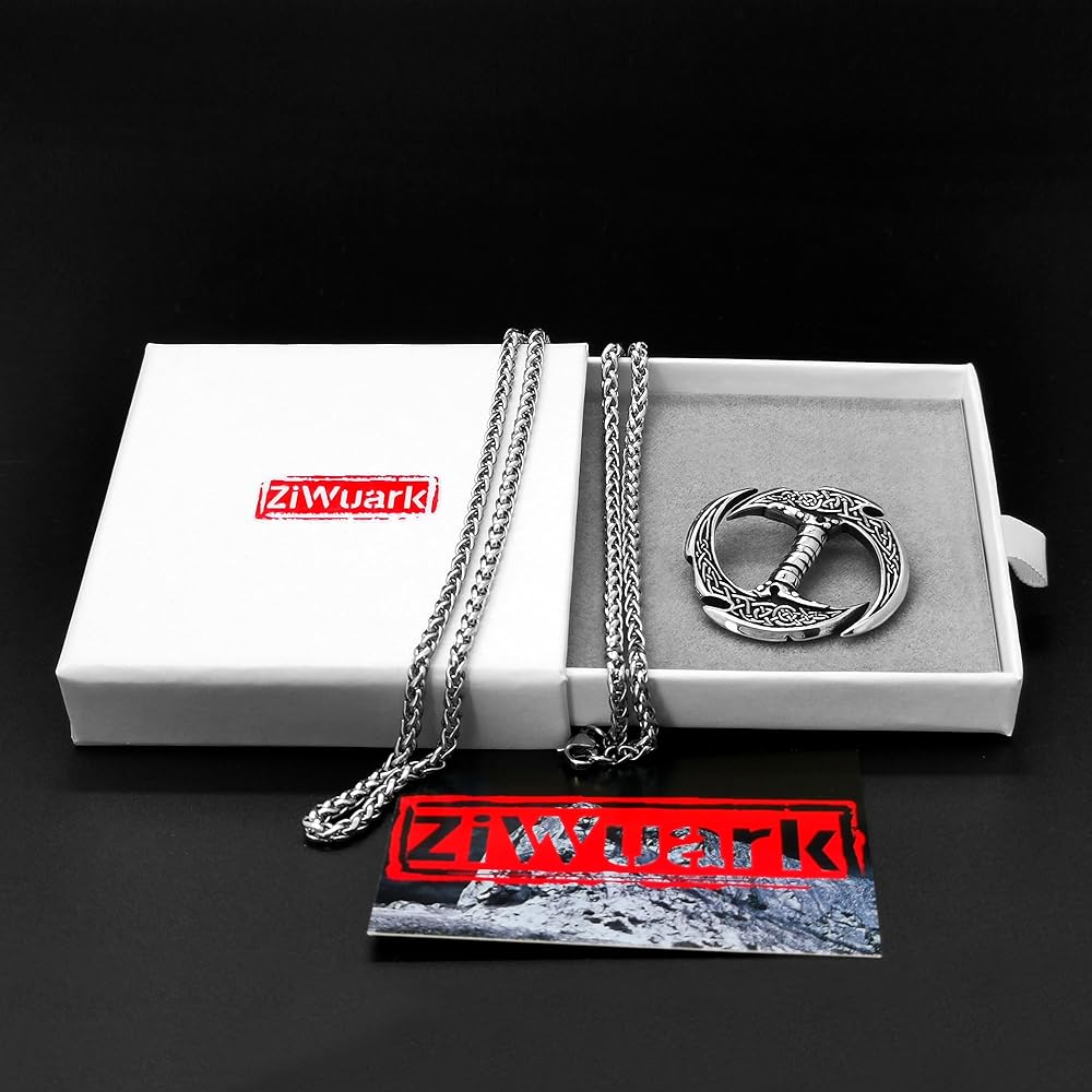 ZiWuark Crescent Double-Edged Sword Necklace is a captivating choice for Viking culture enthusiasts and those seeking unique jewelry. This pendant features a moon blade design inspired by legendary Viking warriors' weapons. Crafted with meticulous attention to detail, it symbolizes power, courage, and the enduring spirit of Norse warriors. Perfectly embodying the rich heritage of Viking culture, it is a meaningful statement piece.