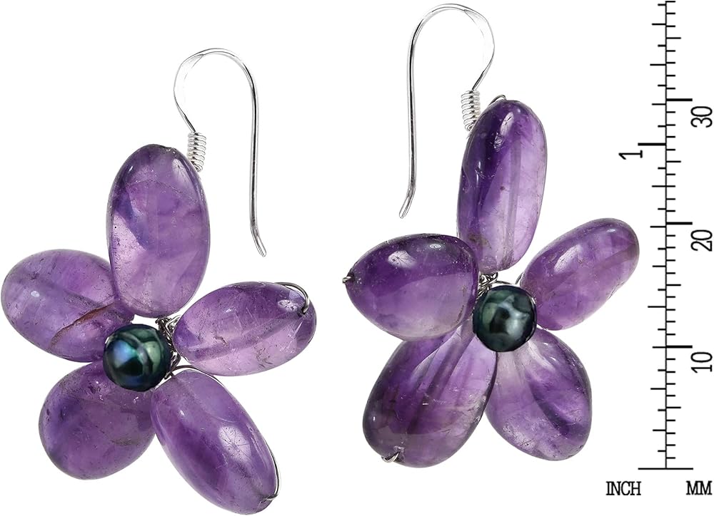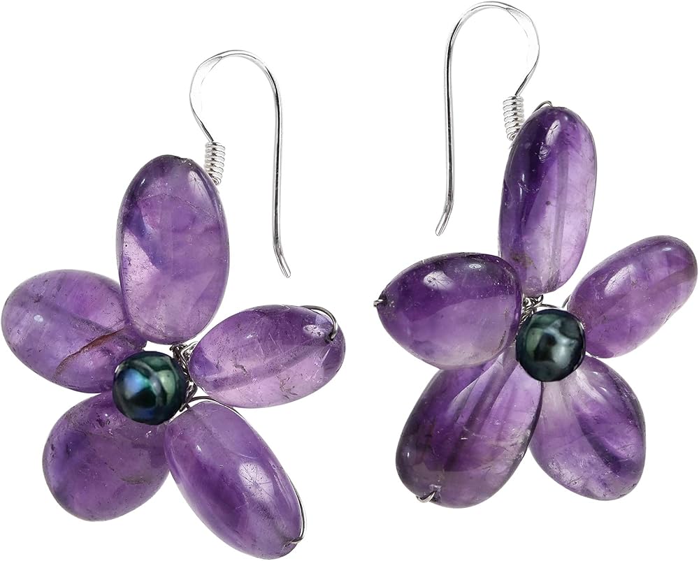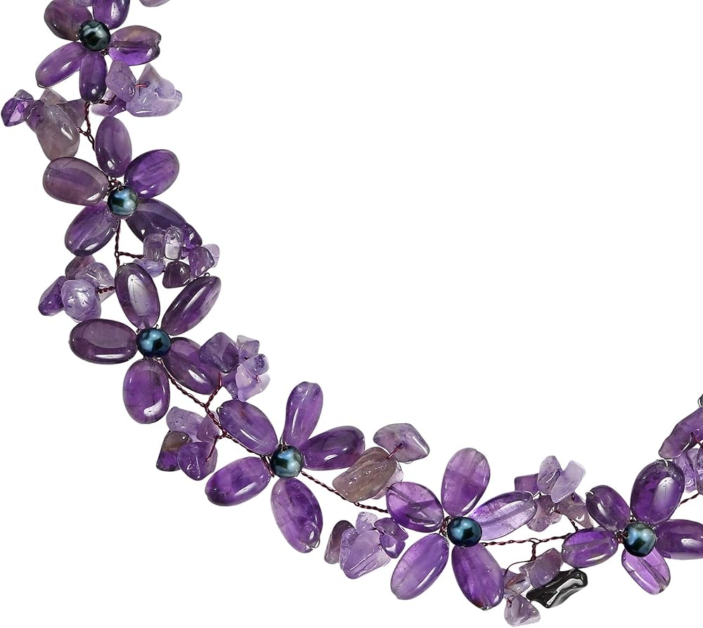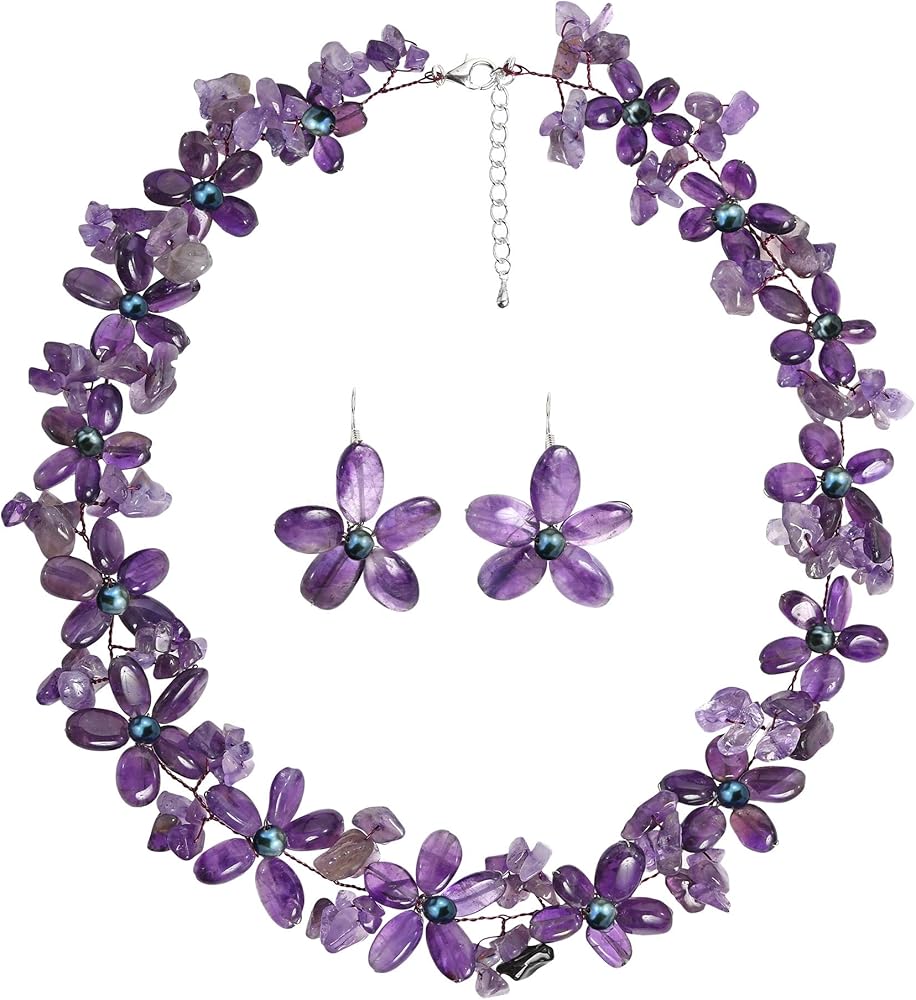 أضفي لمسة أنثوية إلى مظهرك مع مجموعة المجوهرات هذه التي تعرض الكوارتز الأرجواني واللؤلؤ الأرجواني في المياه العذبة (المصبوغة) في تصميم زهري صغير أنيق. تم صنع مجموعة القلادة والأقراط هذه يدويًا في تايلاند على يد حرفي، لاي. يرجى ملاحظة: إن طبيعة هذا المنتج المصنوعة يدويًا ستنتج اختلافات طفيفة في التصميم والحجم والوزن. تحدث اختلافات من قطعة إلى أخرى، قد تختلف القياسات قليلاً.