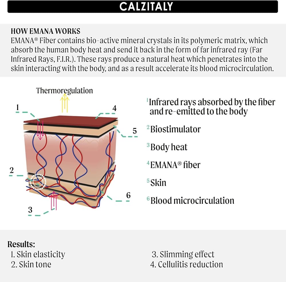 Results: 1. Skin elasticity 2. Skin tone 3. Slimming effect 4. Cellulitis reduction CALZITALY TIPS: In order for this product to produce the desired effects, we advise to wear this anticellulite pyjamas during the night or at home.USE: This piece of cloth is the secret weapon against cellulitis and for this reason CALZITALY suggests you should wear it for at least 30 days and minimum 6 hours per day to obtain visible effects. The longer you wear them, the higher the results are.