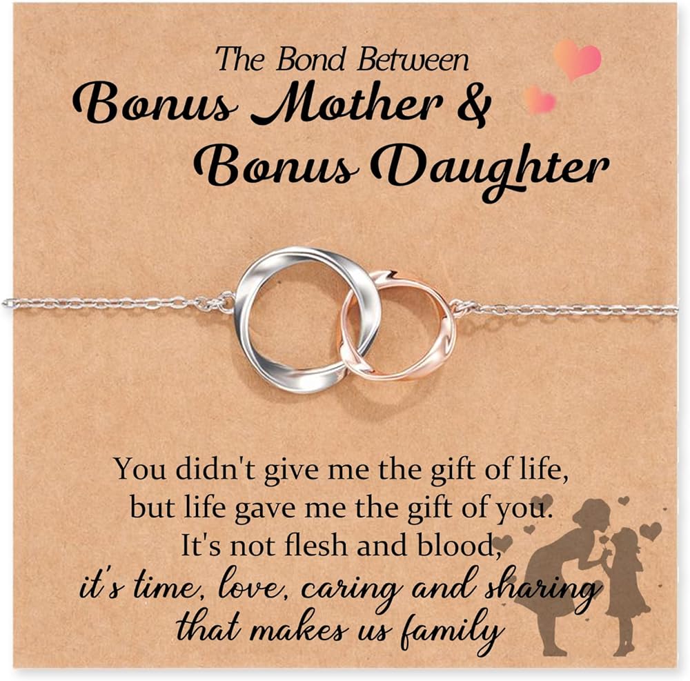 • أساور Bonus Mom Bonus Daughter - السوار المتشابك الذي يحمل معنى "العناية والمشاركة تجعلنا عائلة. شكرًا لك على حبك لي كفرد لك." إنها هدية ذات معنى ولطيفة للتعبير عن الحب بين الأم الإضافية والابنة الإضافية. مثالية لهدايا الأم الإضافية، وهدايا الابنة الإضافية.