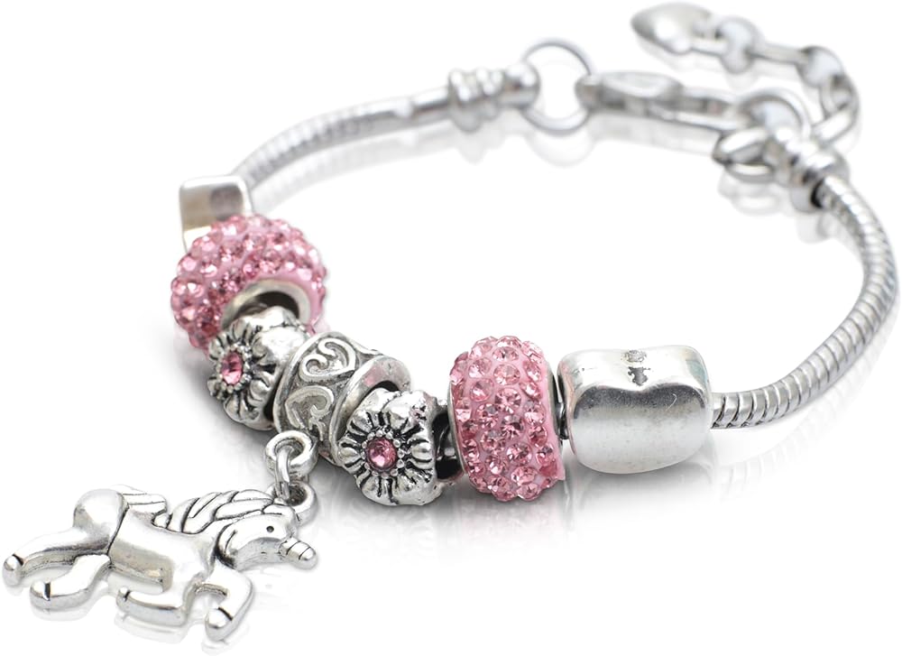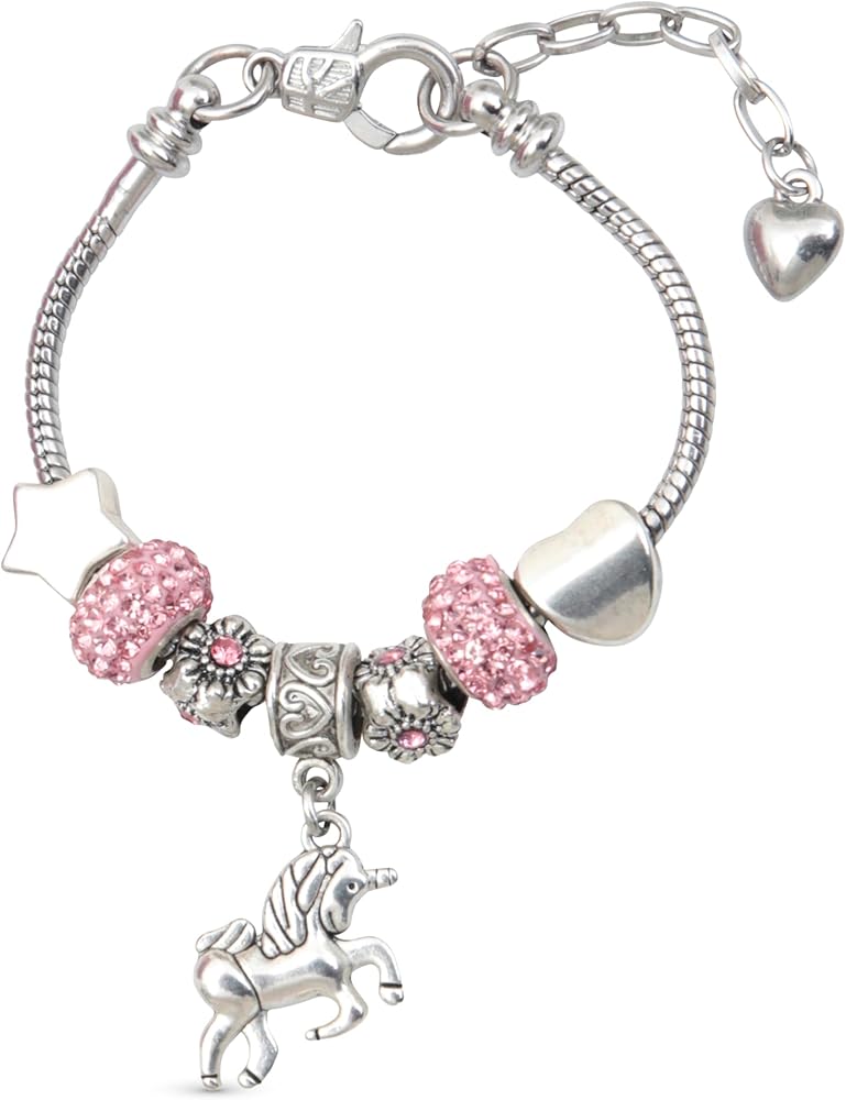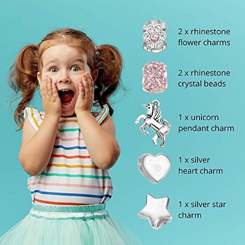 أجمل دلايات للأساور - ستقع كل فتاة صغيرة في حب مجموعة مختارة من الحلي - بما في ذلك ستجد حلية فضية على شكل وحيد القرن، وخرزتين كريستاليتين من حجر الراين، وحلية زهرة من حجر الراين، وحلية نجمة فضية وحلية قلب فضية. مزيج مثالي يكمل أي زي!