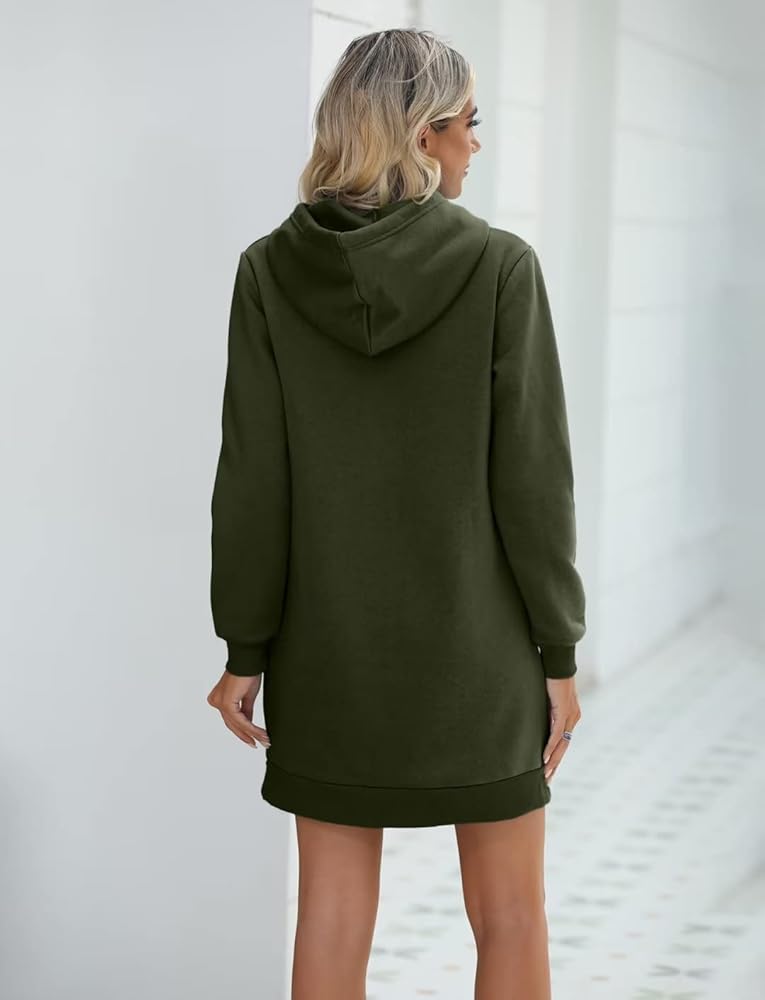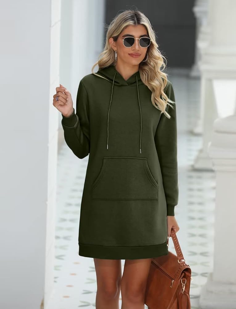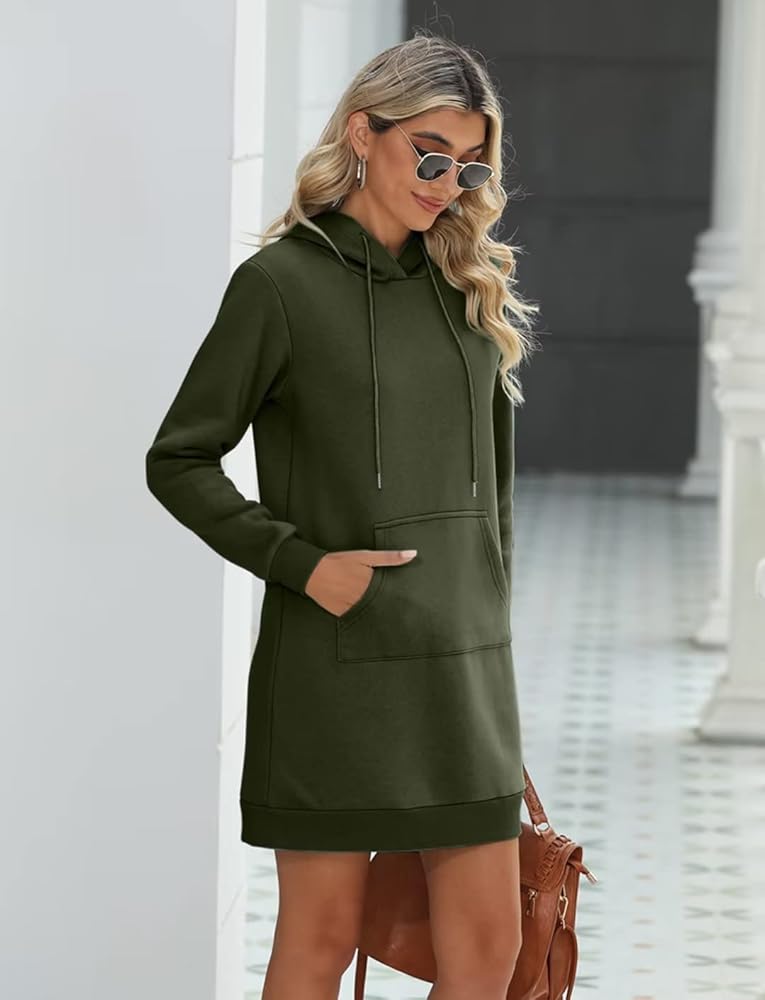 Hooded Sweatshirt Dress: The front kangaroo pocket is versatile and it can make this sweater dress special and keep you hands warm in fall and winter. Drawstring hooded neck pullover design is easy to dress up and down. 3 types: Solid, Cute LOVE Print, Cute Sunflower Print.