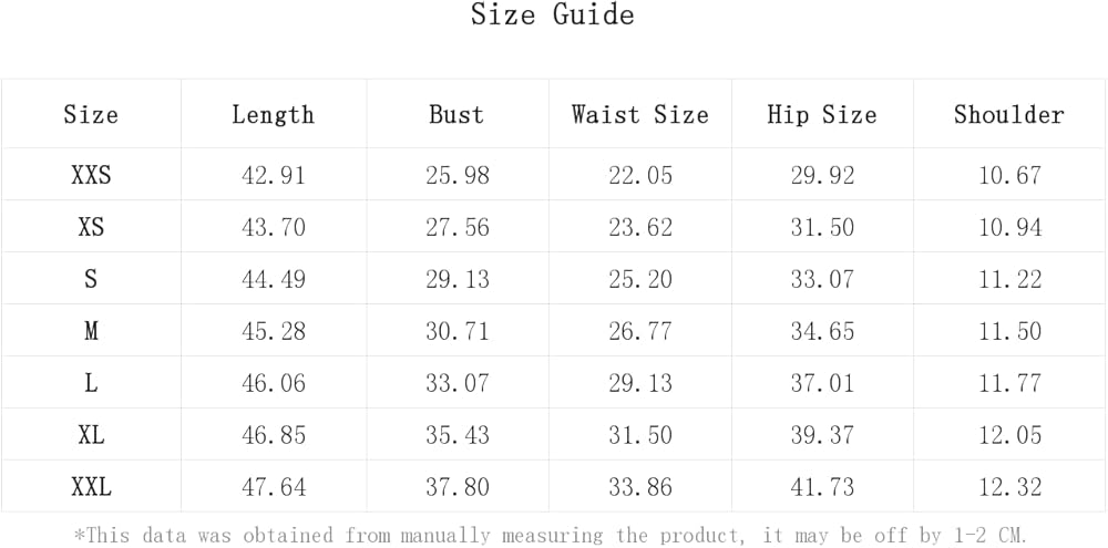 XS: US: 2", Bust: 27.6", Hip Size: 31.5", Length: 43.7", Shoulder: 10.9", Waist Size: 23.6"