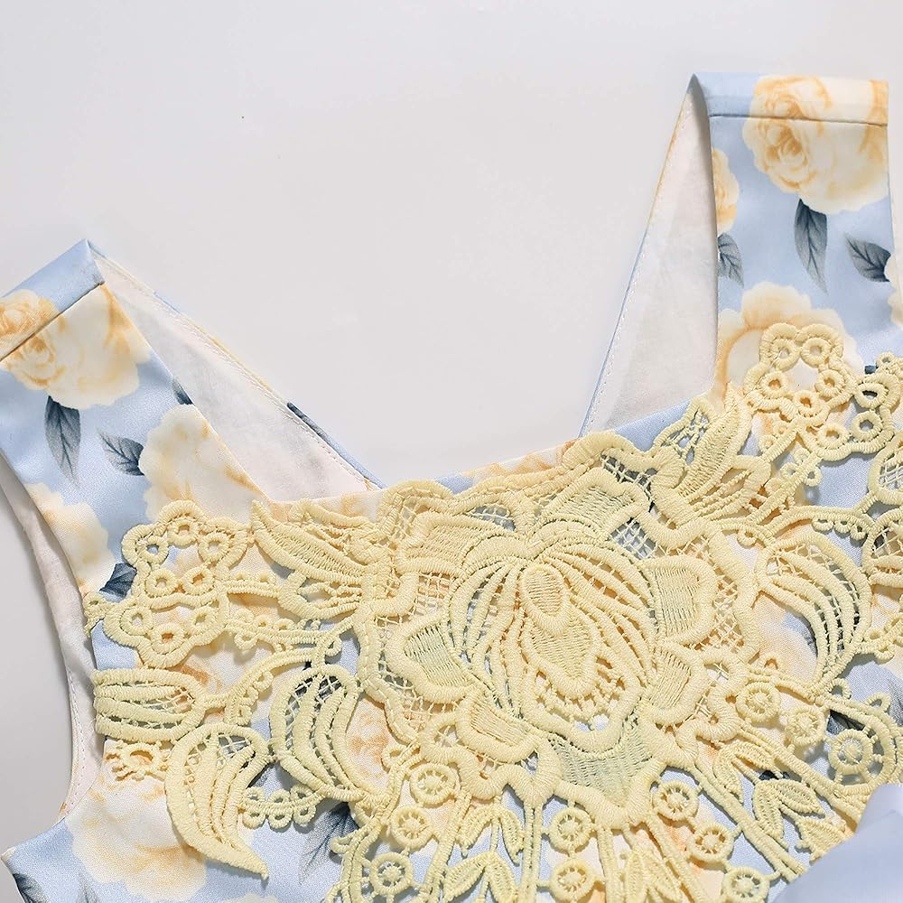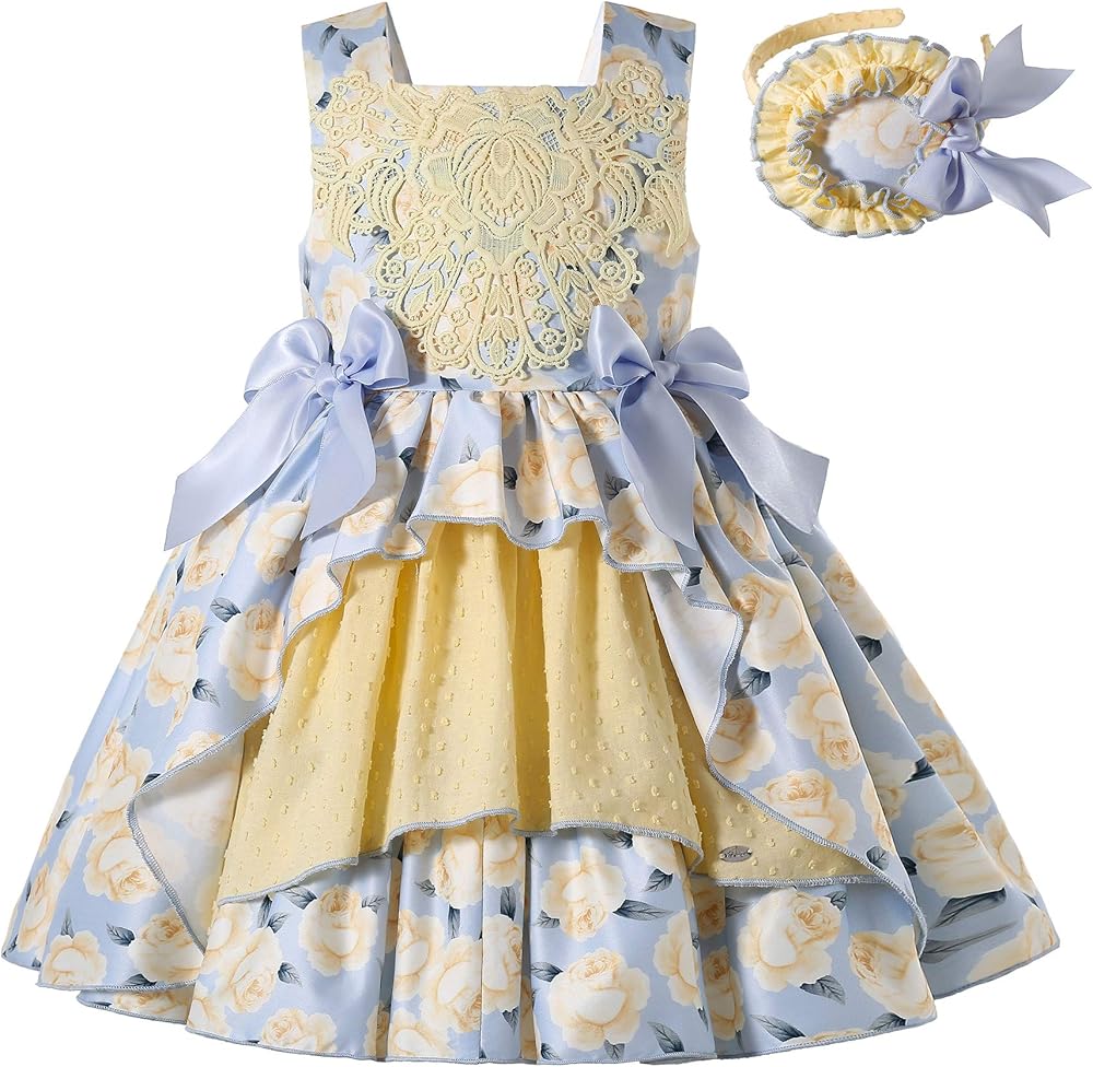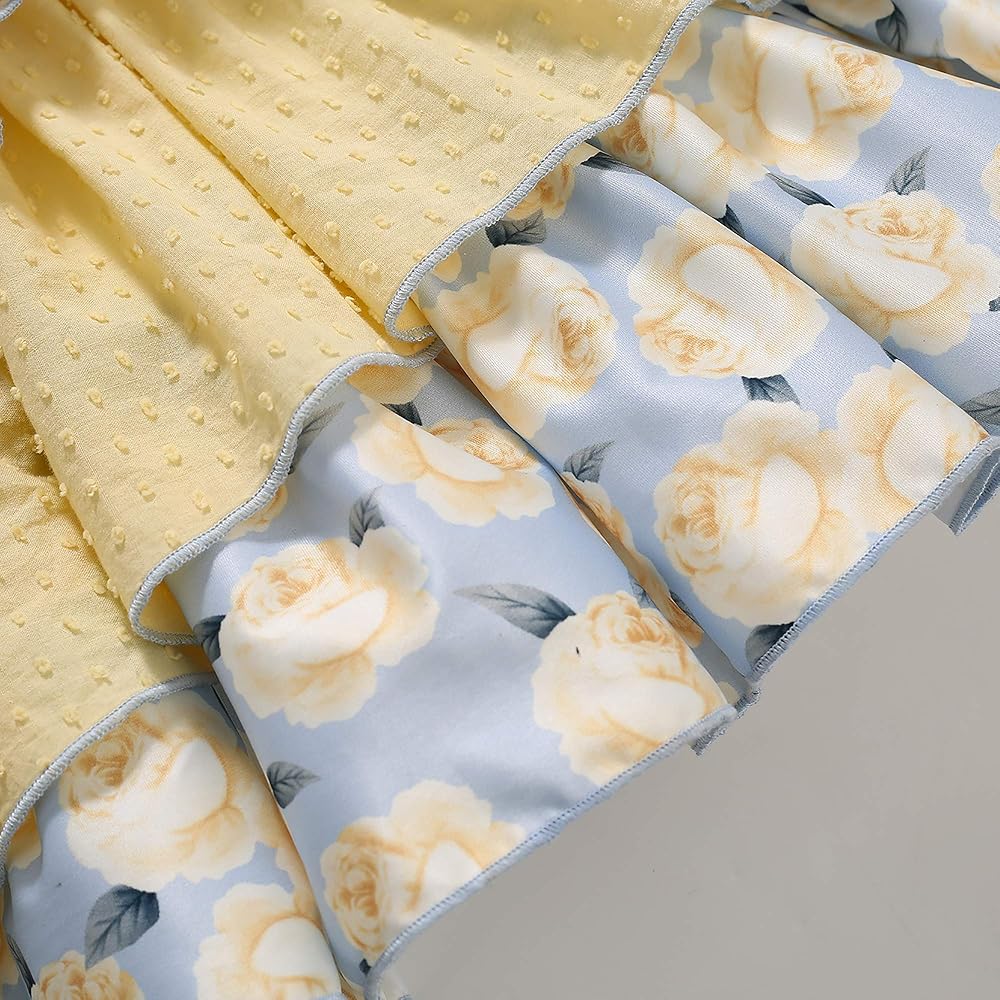 • فستان فتاة بطباعة أنيقة على شكل زهرة صفراء، وياقة مربعة بسيطة، وزخرفتان صغيرتان على الخصر، جميع التصميمات تجعل هذا الفستان أكثر أناقة.