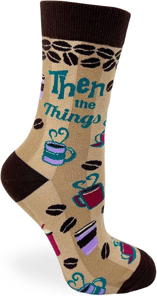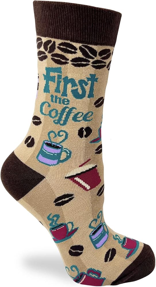 جوارب مبتكرة - جوارب نسائية بلون بني وكاكي تتميز بأكواب القهوة وحبوب القهوة وتقول "First the Coffee".