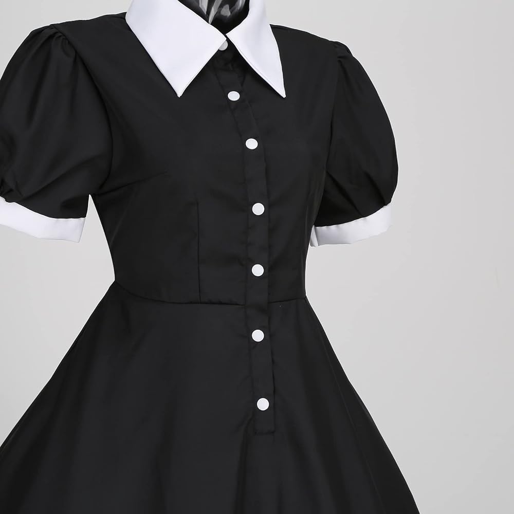 【أنيق】يتميز زي الخادمة النسائية برقبة على شكل طية صدر السترة، وفتحات حادة، وأزرار بيضاء واضحة في الأمام، وهو أنيق وساحر. يضيف الطراز القديم مظهرًا قويًا، كما أنه يتماشى جيدًا مع زي فستان الستينيات، قل مرحبًا بالسيدة ميد.