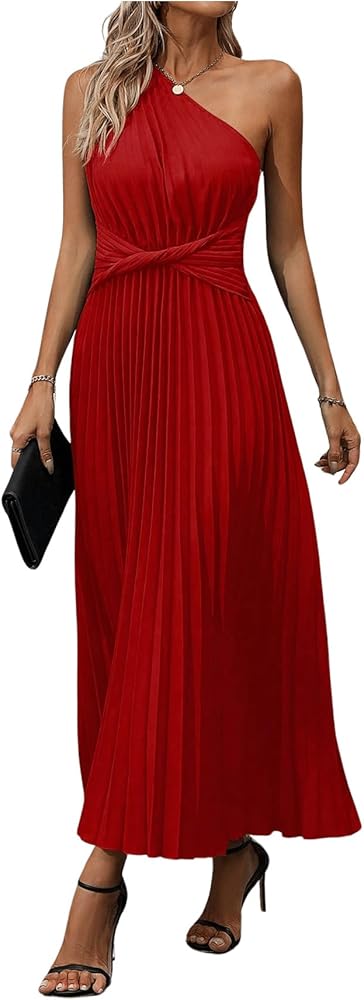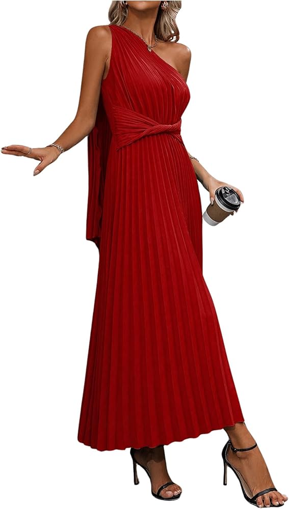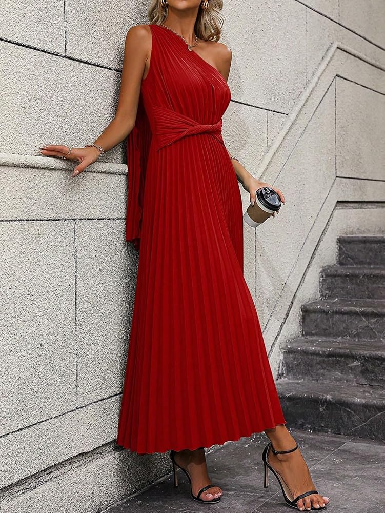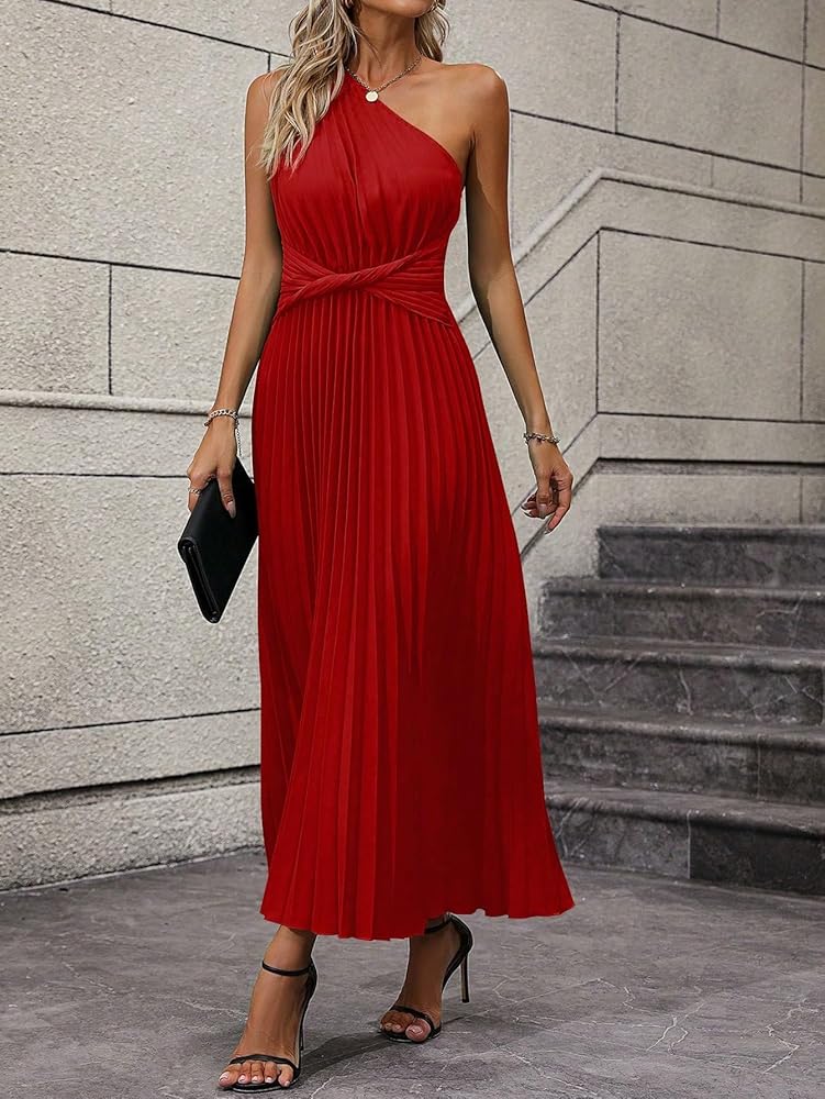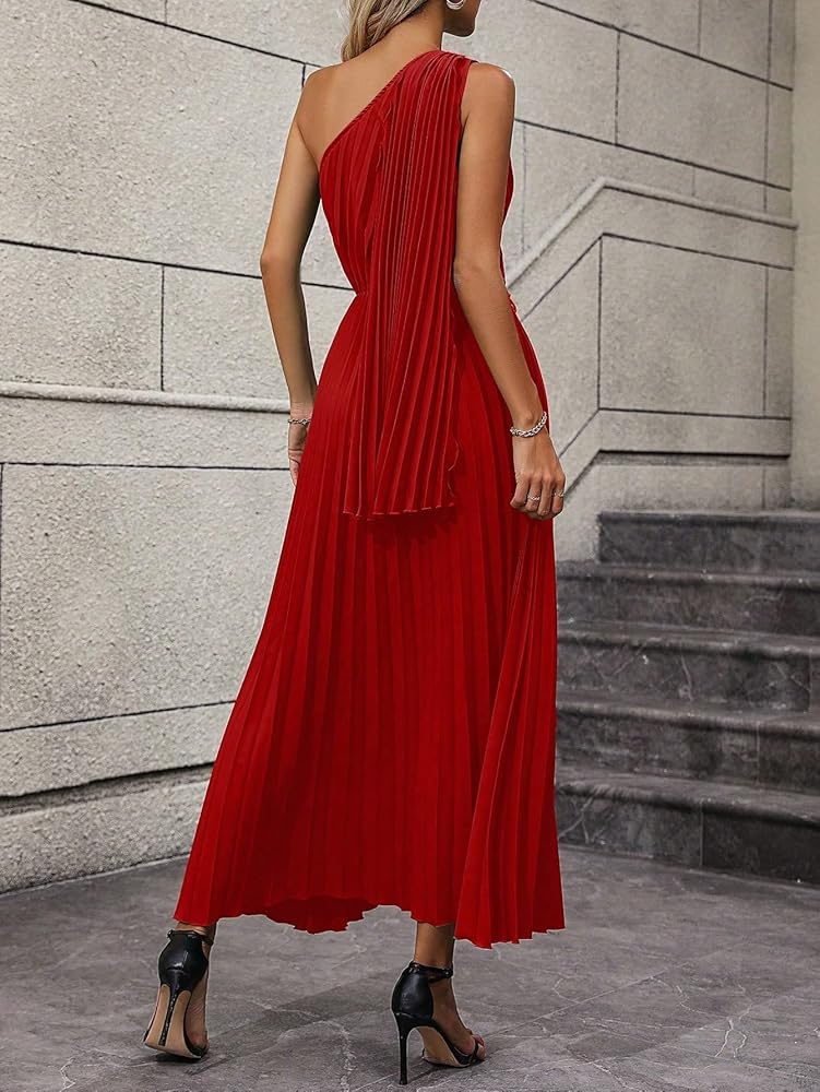 - التصميم: بدون أكمام، كتف واحد، رقبة غير متماثلة، مقدمة ملتوية، فستان طويل بكسرات