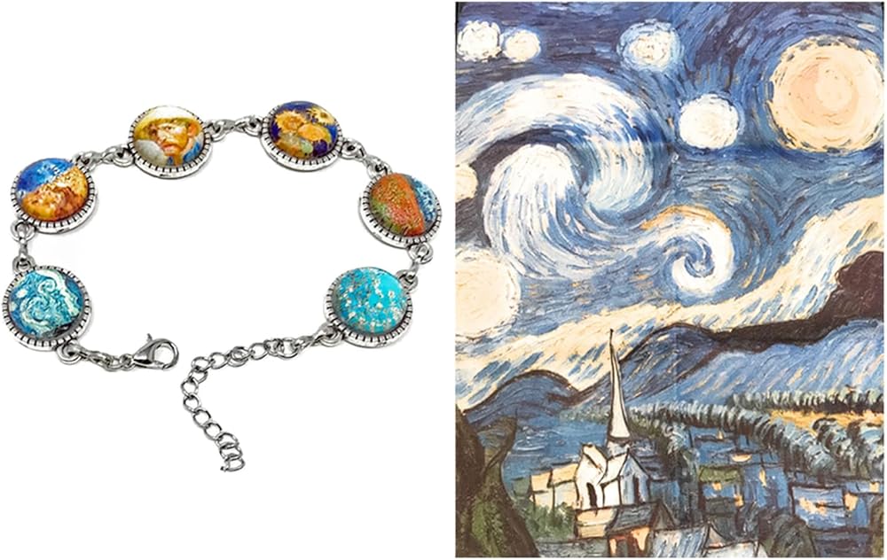 ** فن مجموعة فان جوخ ** معدن فضي مع حواف صغيرة حول الصور. على هذا السوار مترابط معًا اللوحات الشهيرة : صورة ذاتية، حقل مع الخشخاش الحمراء، مزهرية بخمس عباد الشمس، أزهار اللوز، ليلة النجوم ، حقل القمح مع الغراب. الصور هي تحت الزجاج قبة ونصف بوصة في الحجم.