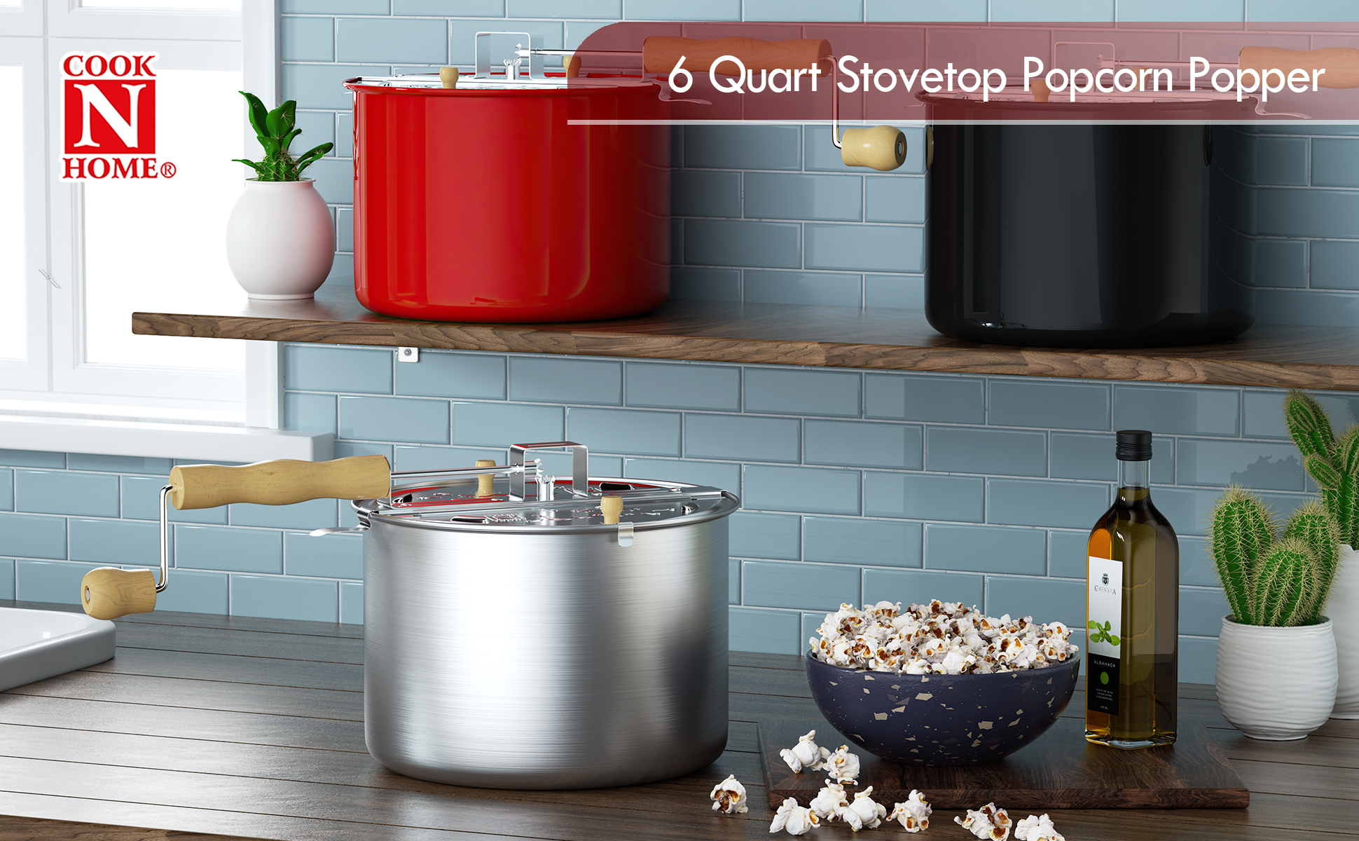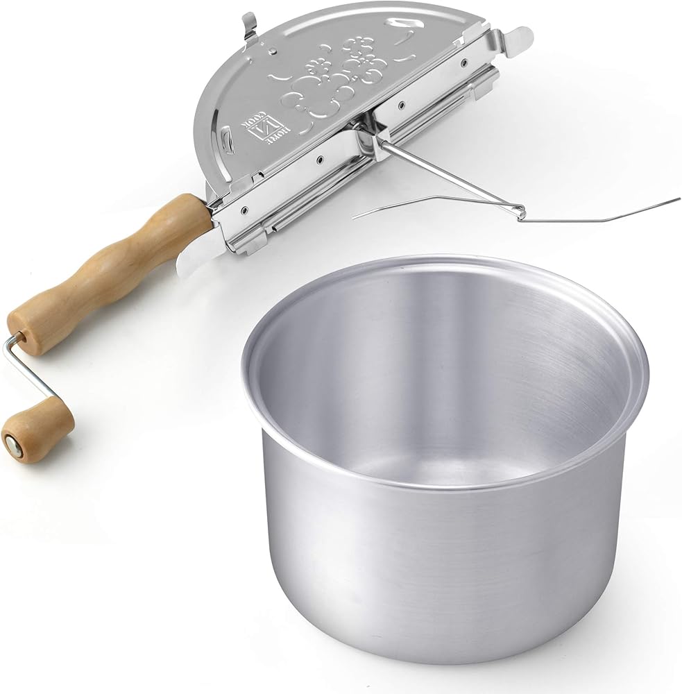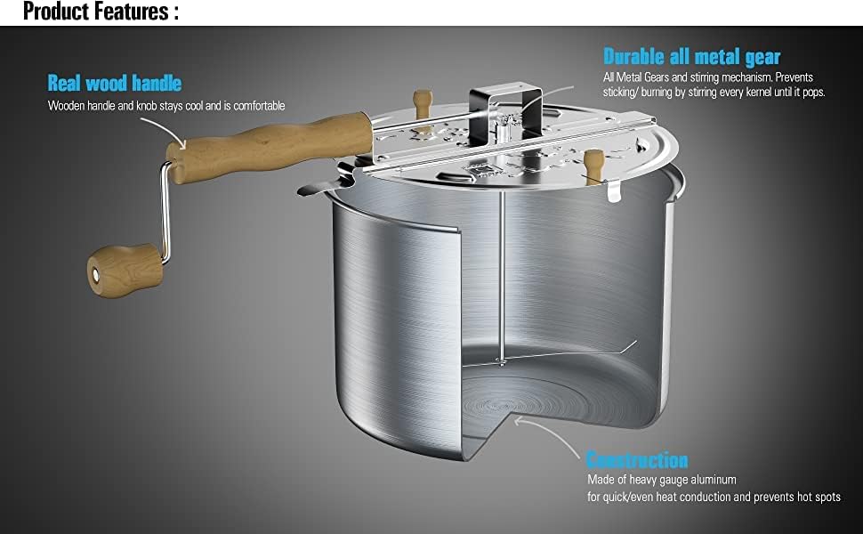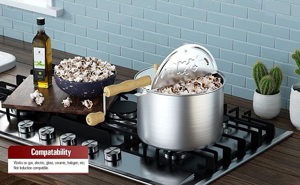 ماكينة صنع الفشار كوك ان هوم سعة 6 كوارت مصنوعة من الألومنيوم. غطاء من الستانلس ستيل يحتوي على فتحات بخار للحفاظ على الفشار مقرمشًا. مقبض خشبي ومقبض يبقى باردًا ومريحًا. يصنع الفشار في بضع دقائق ويسهل سكبه. يمزج الحبوب حتى لا تلتصق أو تحترق. غير متوافق مع الحث، يعمل على الغاز والكهرباء والزجاج والسيراميك وما إلى ذلك. غير آمن للغسل في غسالة الأطباق، امسحه بقطعة قماش للت