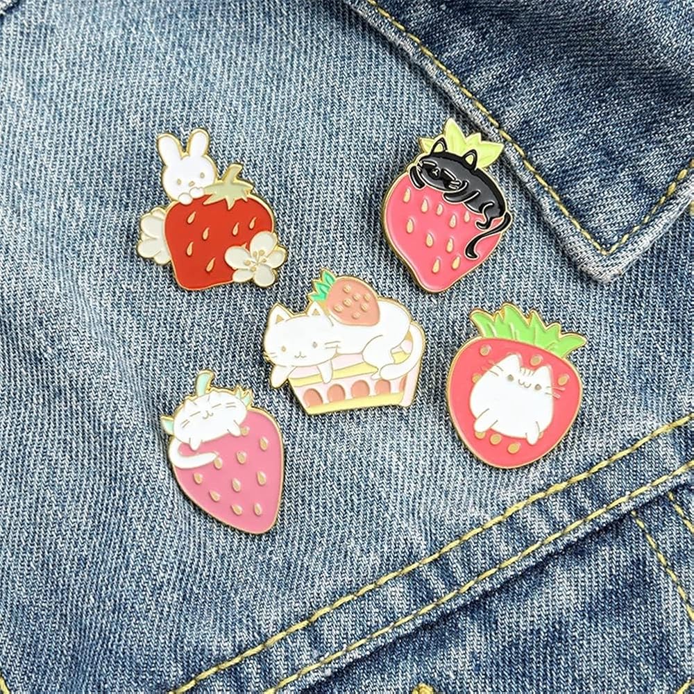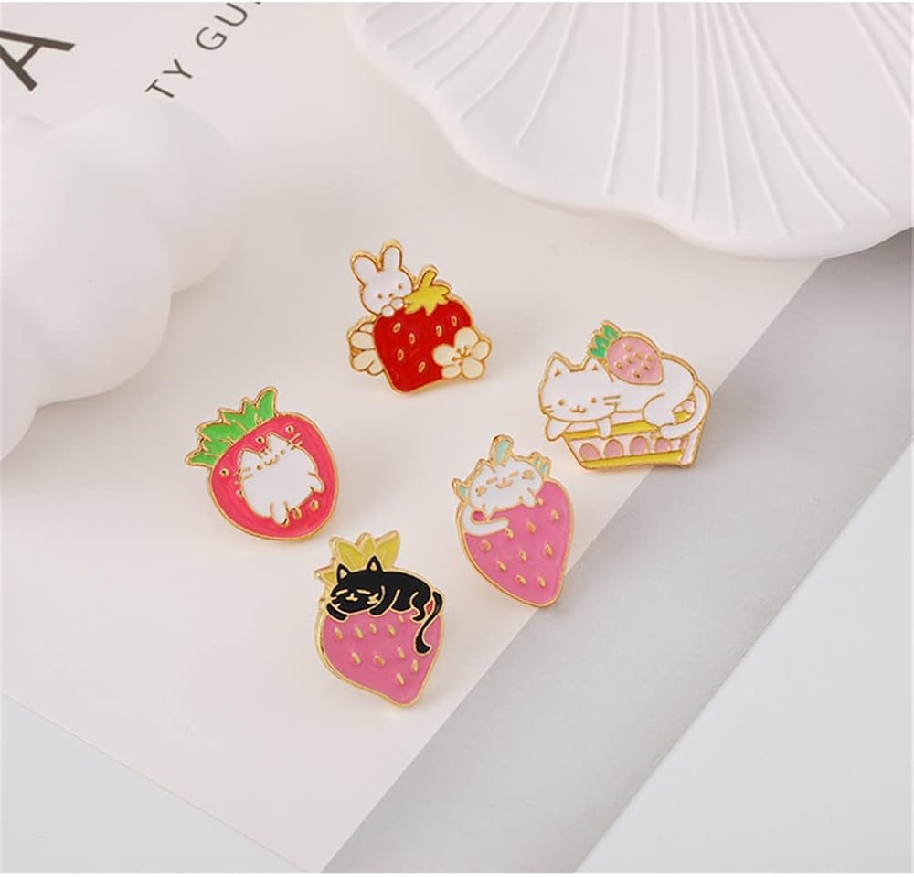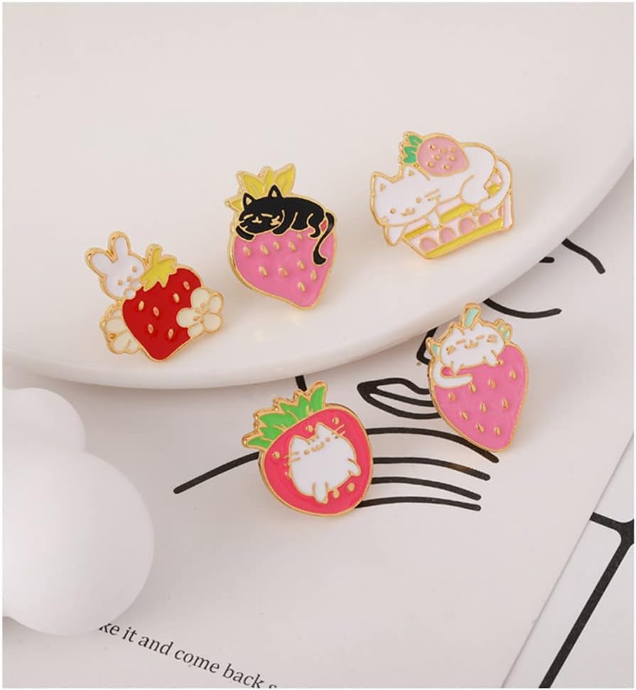 Cute Strawberry Animal Enamel Pin Cartoon Cat Bunny Fruit Cake Brooches Lapel Pins Badge Women's Jewelry Fashion Jewelry Gift for Kids Friends, Metal, no gemstone