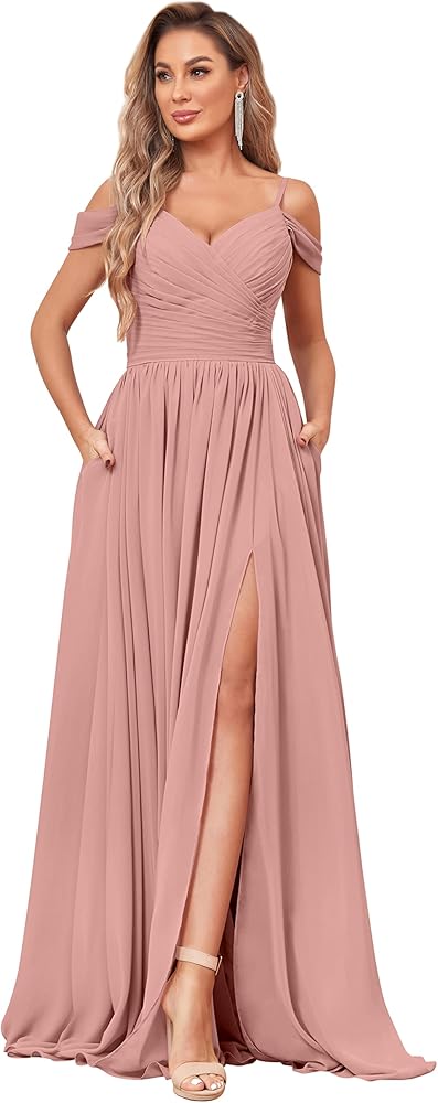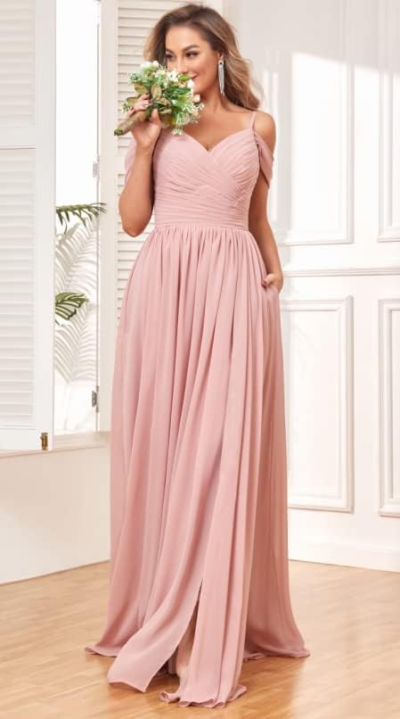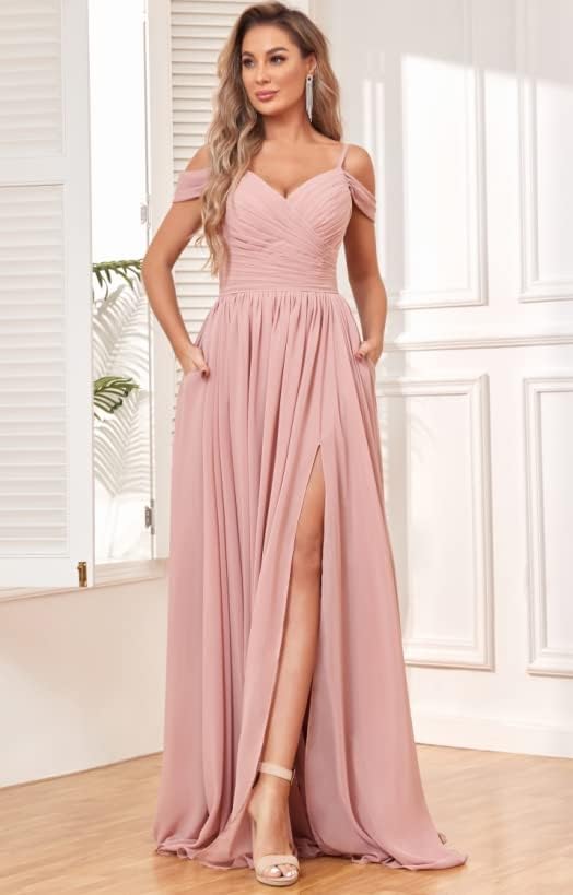 بولينسي فساتين وصيفات العروس بدون اكتاف مع جيوب شيفون مكشكشة بفتحة طويلة فستان سهرة رسمي