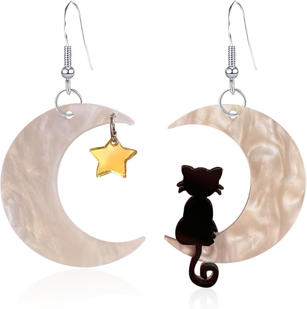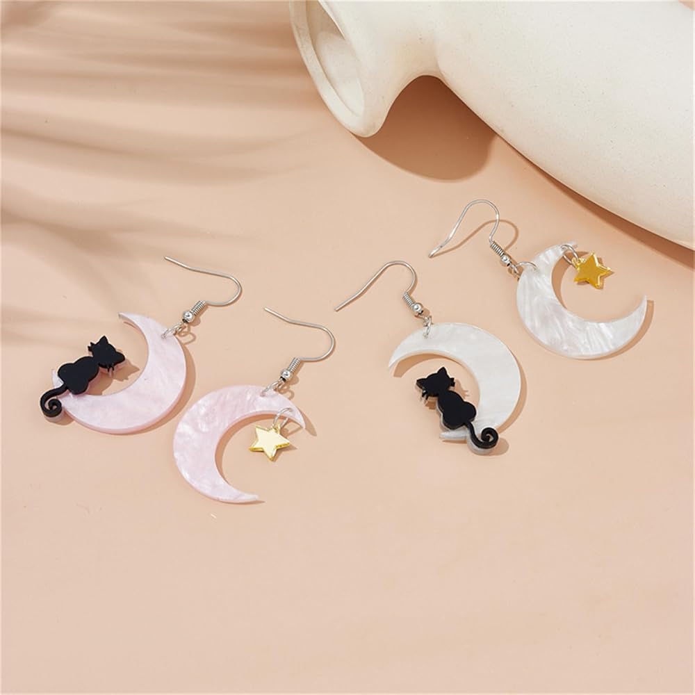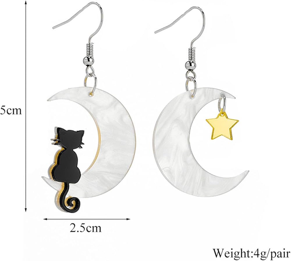 القطة السوداء على القمر أقراط نجمة للنساء الفتيات الإبداعية غير المتماثلة الكرتون الاكريليك الراتنج الهلال القمر الأسود الحيوانات الجميلة الحيوانات الأليفة خفيفة الوزن تتدلى أقراط للهدايا مجوهرات حفلة الهالوين
