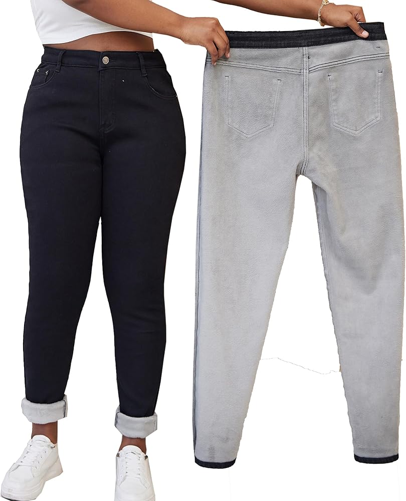 • جينز شتوي للسيدات بنطال ضيق سميك مبطن بالصوف، سروال ضيق دافئ قابل للتمدد