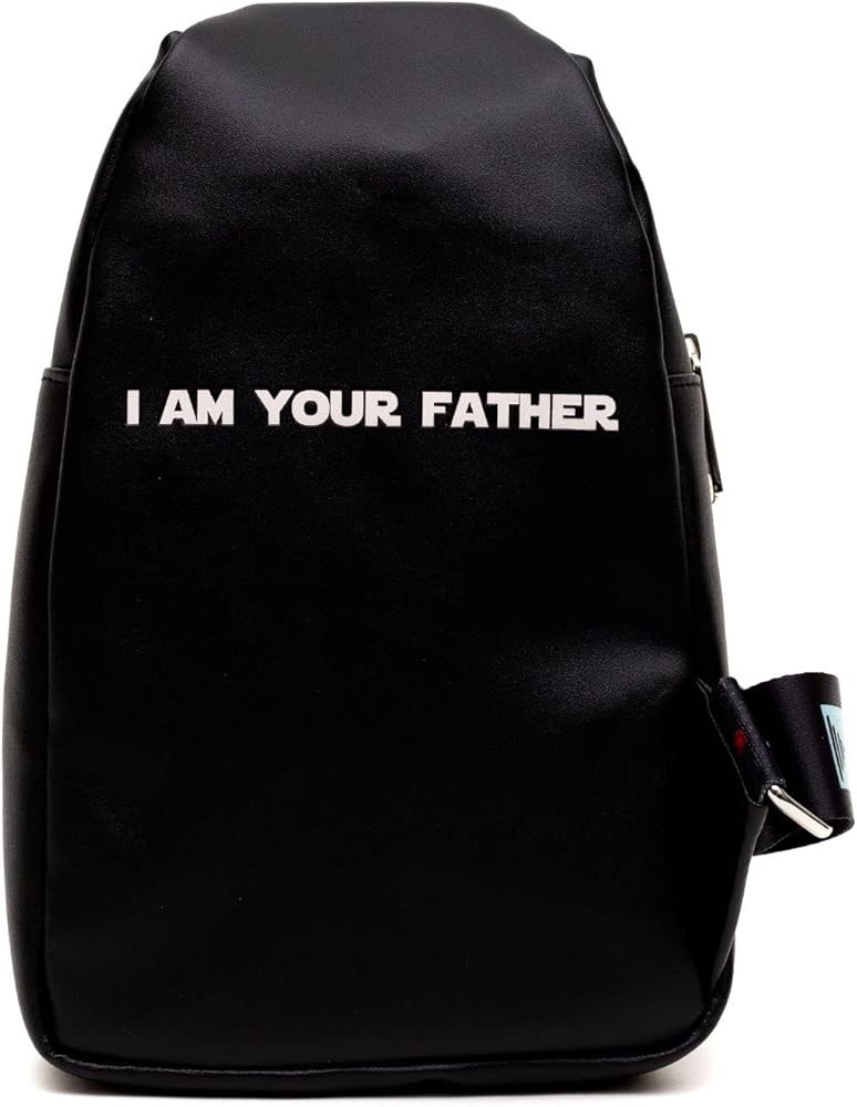 Unleash your inner Sith Lord with our Star Wars Bag, Sling, Darth Vader, Bounding, Vegan Leather! Crafted from high-quality vegan leather, this cross body sling bag is designed to make an unforgettable statement. The black 11.0" x 6.5" dimensions make it perfect for carrying your essentials while on the move. Featuring the iconic "I AM YOUR FATHER" quote and Darth Vader's imposing figure, this black Star Wars Darth Vader Crossbody Sling Bag is a great gift for that Star Wars lover in your life.