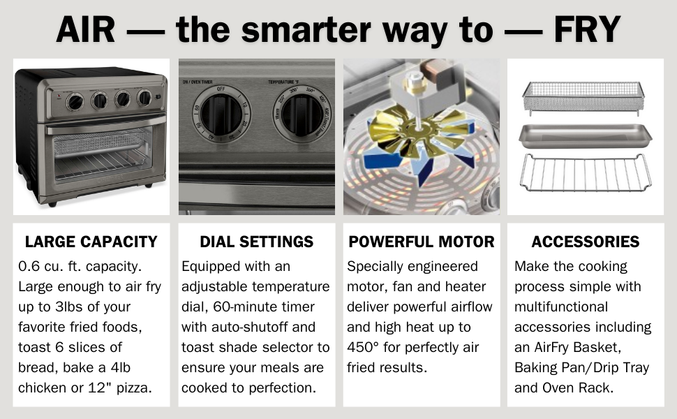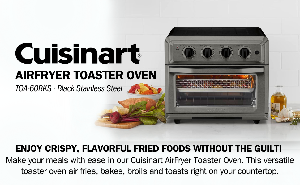 أصبح جهاز AirFryer المميز من Cuisinart أفضل! بالإضافة إلى البطاطس المقلية باستخدام AirFrying أو خبز البسكويت أو تسخين بقايا الطعام، يمكنك الآن إعداد وجبات لذيذة أكثر في فرن محمصة الخبز Cuisinart AirFryer مع الشواية! قم بتحميص شرائح اللحم والخضروات على جانب واحد وشوي وجبة الإفطار المثالية على الجانب الآخر باستخدام الشواية الجديدة ذات الوجهين ولوحة الشواء. أحضر الجيل التالي من الطبخ إلى سطح العمل الخاص بك مع الفرن الواسع ذو 8 وظائف الذي يجعل الطبخ وليمة للعائلة والأصدقاء - أو وجبة خفيفة بسيطة لشخص واحد - ممتعة وسريعة وسهلة!