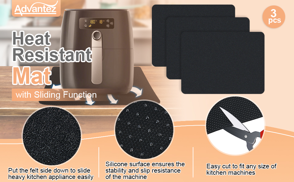 حصيرة مقاومة للحرارة من Advantez للمقلاة الهوائية، 3 قطع من منزلقات أجهزة المطبخ وحصيرة غير قابلة للانزلاق، حصيرة طاولة المطبخ، واقيات مضادة قابلة لإعادة الاستخدام لمقلاة الهواء وخلاط وصانع القهوة وبخار الميكروويف