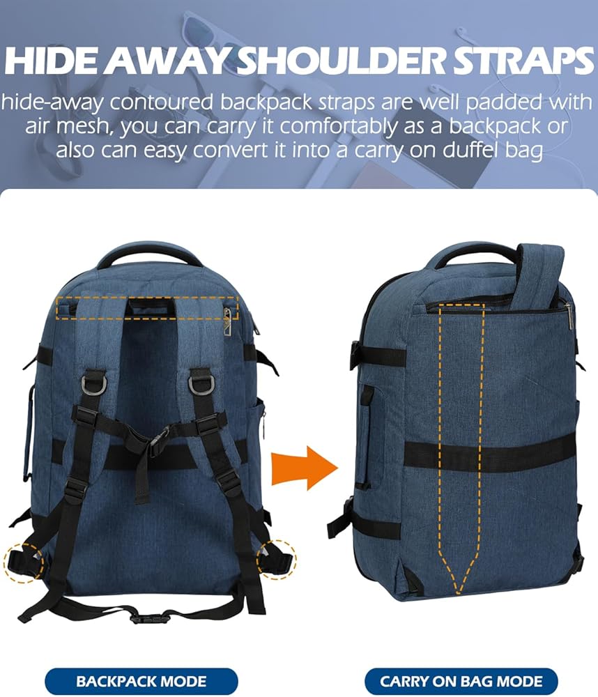 【Comfortable to Carry】hide-away contoured travel weekend backpack straps are well padded with air mesh, can carry it comfortably as a carry on backpack or also can easy convert it into a travel duffel bag; provide 4 carrying options for travelers' multiple alternatives; there is 1 sternum strap that adjusts lengthwise and slides up and down the shoulder straps, and 1 adjustable waist strap designs for stabilization and carry comfort