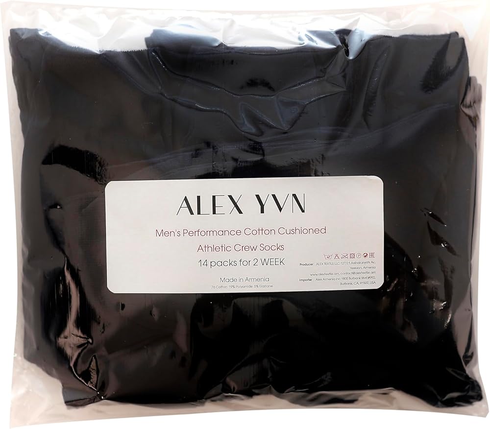 ALEX YVN Men's Performance Cotton Cushioned Athletic Crew Socks (14 Pairs) offer the perfect combination of cushioning and comfort. Supportive fit with arch compression. Reinforced heel and toe for enhanced durability. Sizing: Men's Medium (6-7), Large (8-9) & X-Large (10-11)