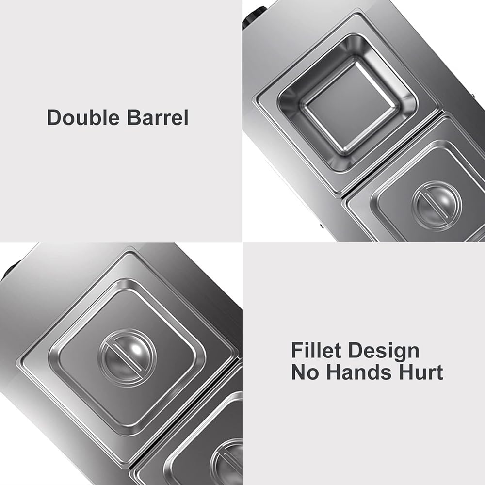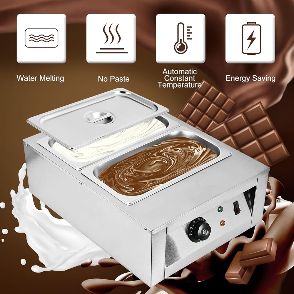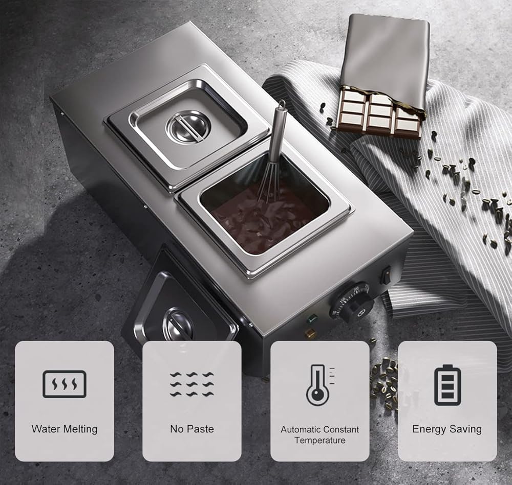 • 【خزانات مزدوجة】 - تصميم الحاوية المزدوجة يلبي احتياجاتك في ذوبان المكونات المختلفة، مثل الشوكولاتة البيضاء والشوكولاتة الداكنة. تصل السعة الإجمالية القصوى إلى 8 كجم/17.6 رطل.