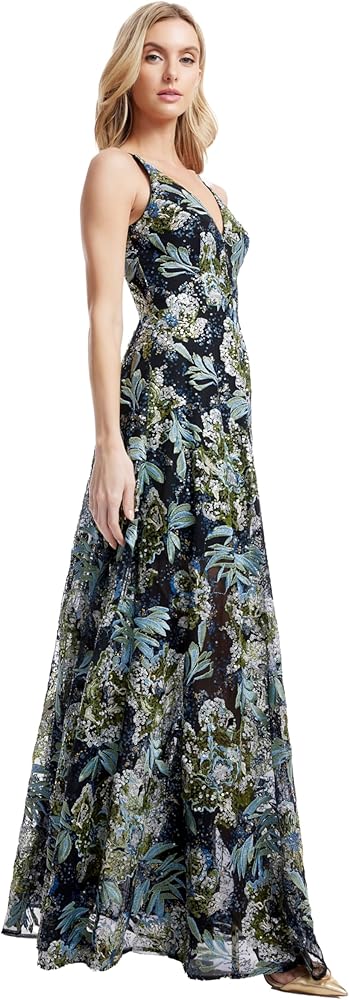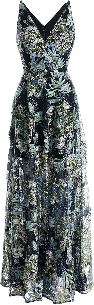 V-Neck Fit and flare floral sequin gown Fully Lined No Stretch Fit and Flare Silhouette Self: 100% Polyester Lining: 100% Polyester 48 1/2" Length from CF Machine Wash Cold, Do Not Bleach, Tumble Dry Low, Low Iron Inside Out If Needed, May Be Dry Cleaned