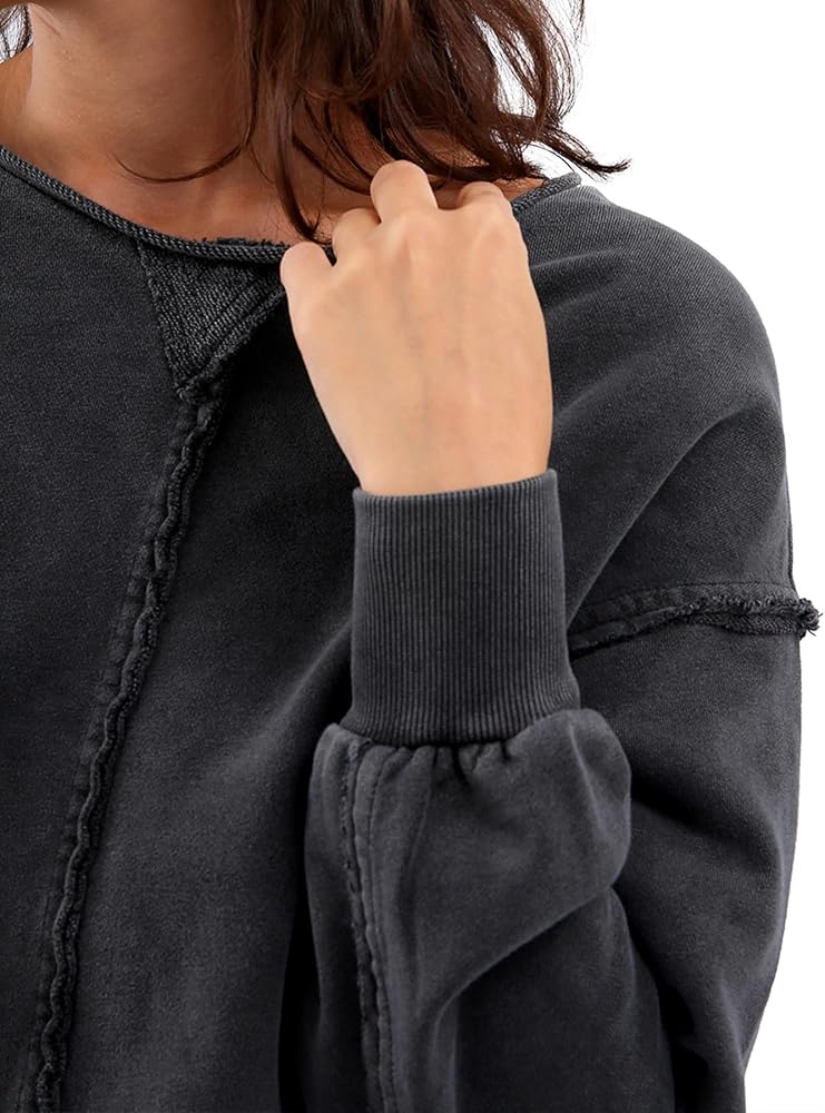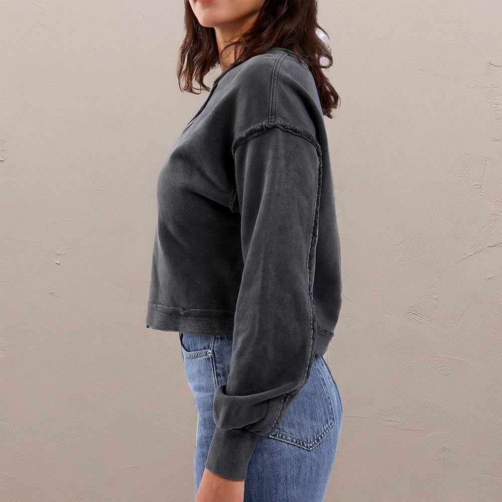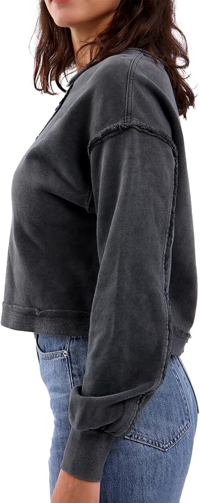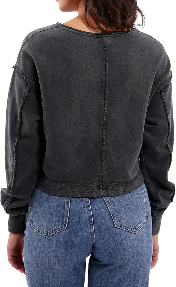 A washed crop top sweatshirt features a drop shoulders, long sleeves, crew-neck, exposed seams, V-notch stitch, crop hem, loose fit, vintage style