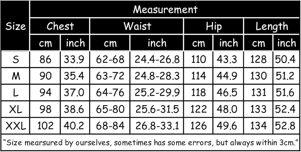Size L: Chest 94cm/37.0inch---Waist 64-76cm/25.2-29.9inch---Hip 118/46.5inch---Length 131cm/51.6inch