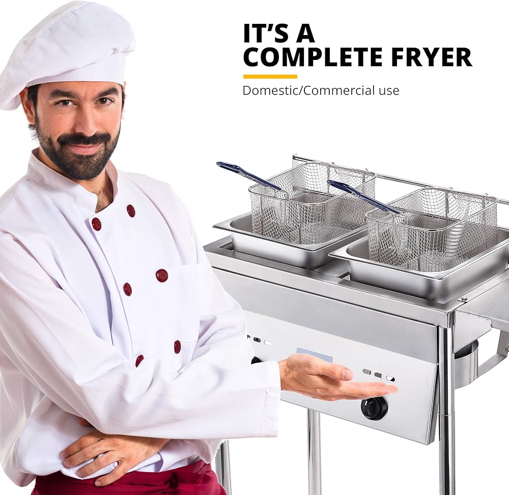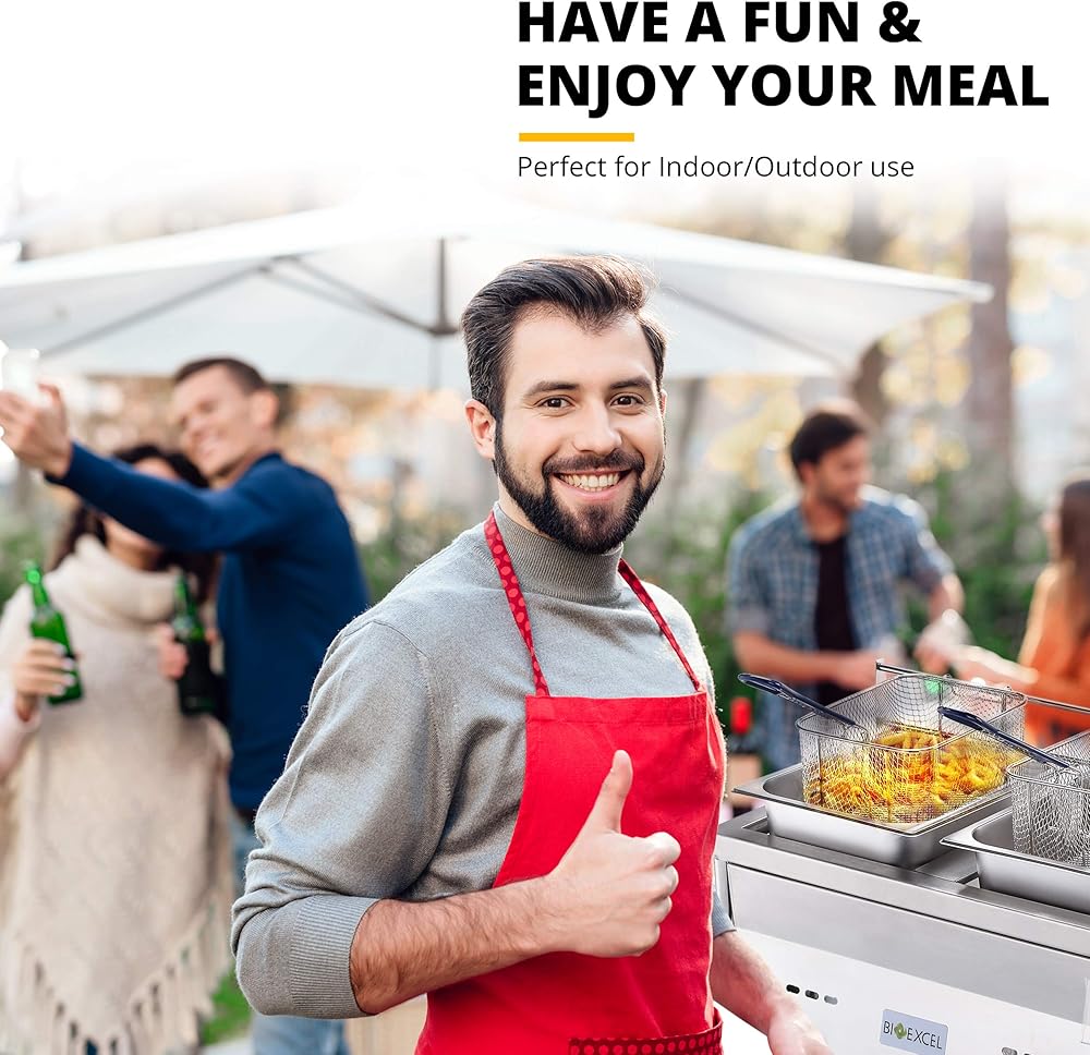 يتم طهيها بشكل مثالي، تظهر المقلاة العميقة مع سلة مع خزانين للزيت، وأغطية الخزان، ورف من الستانلس ستيل القابل للإزالة، وسلتين شبكيتين سلكيتين مطليتين بالكروم لتصريف الزيت بعد قلي الوجبات الخفيفة، استخدم السلال لتصريف الزيت الزائد من طعامك حتى لا يصبح دهنيًا جدًا