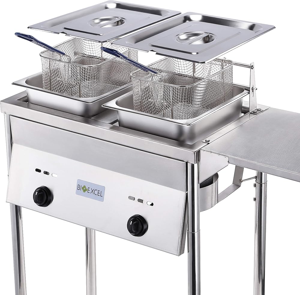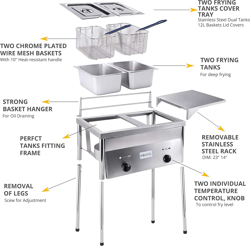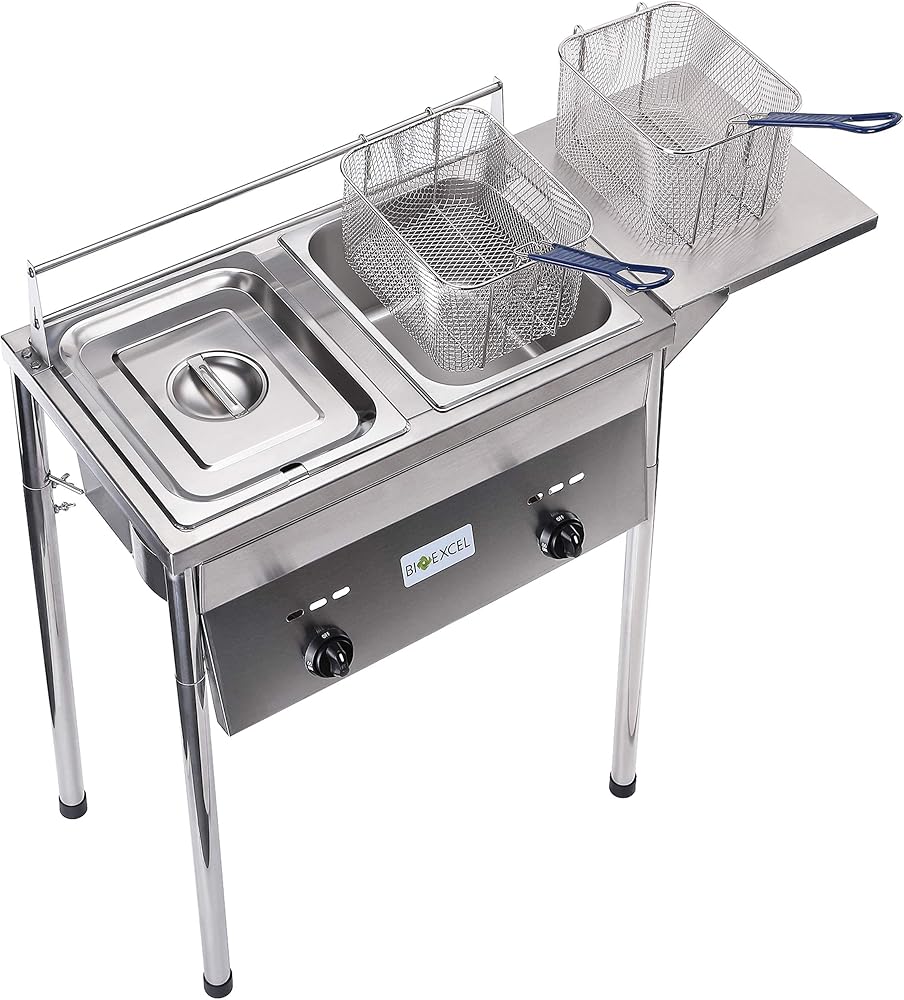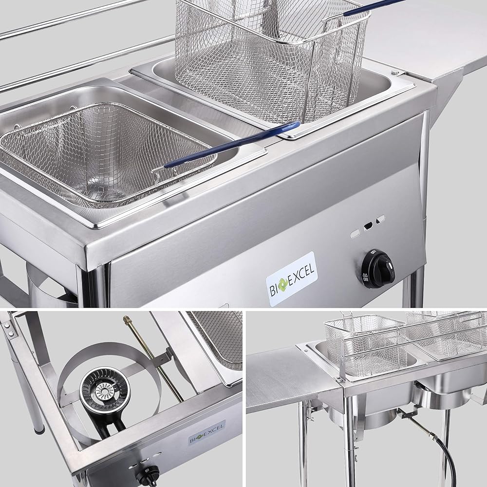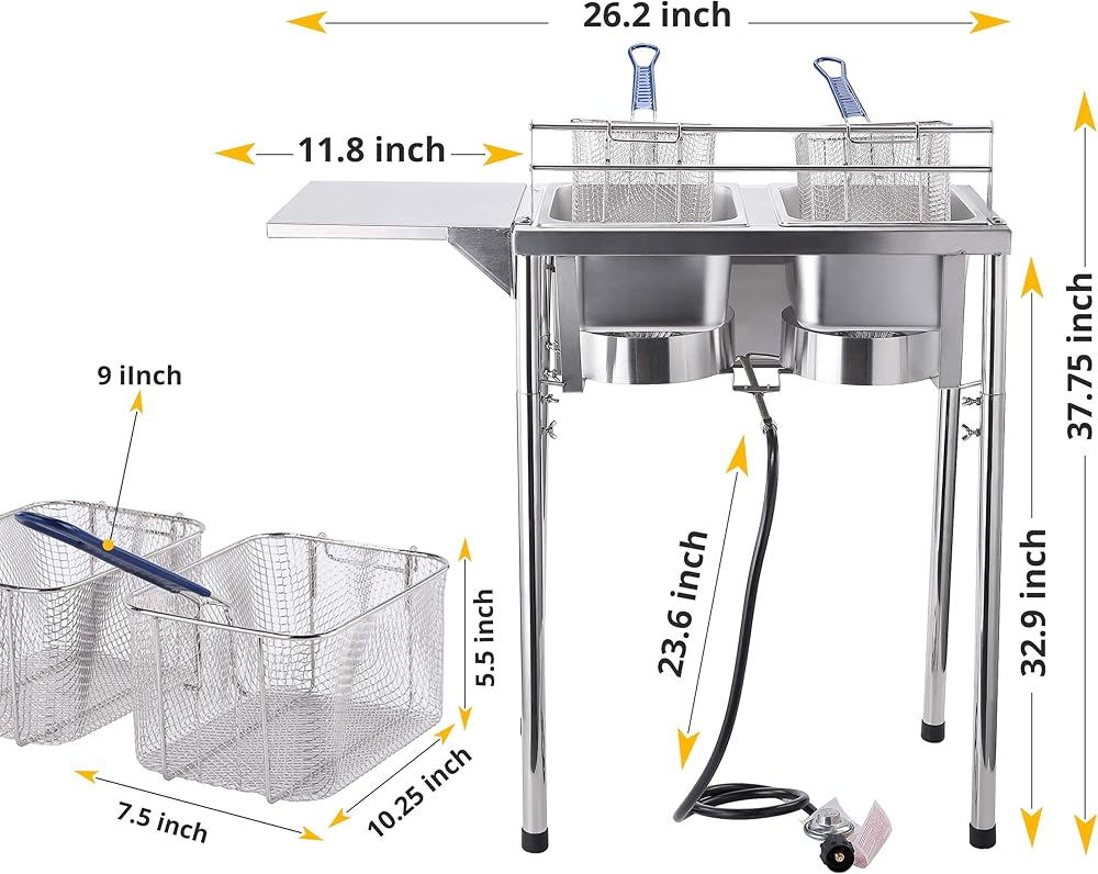 مقلاة عميقة مثالية للاستخدام في الهواء الطلق، يمكن لكل خزان زيت استيعاب 1.5 إلى 2 جالون من الزيت وهي قابلة لتعديل الارتفاع ولها أرجل قابلة للفصل. تحتوي مقلاة البروبان العميقة الخاصة بنا على مواقد من الحديد الزهر عالية الإخراج